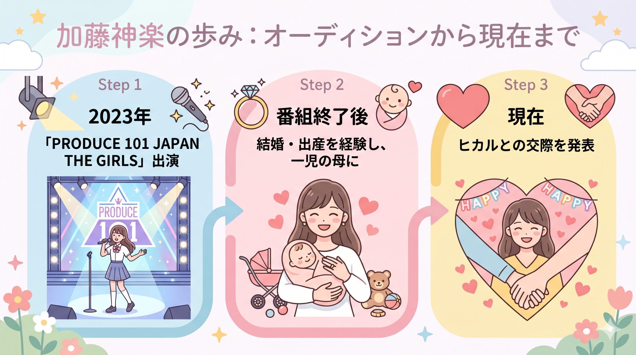 X(旧Twitter)のトレンドで「加藤神楽」の名前を見て、心臓が跳ねませんでしたか? かつてオーディション番組「PRODUCE 101 JAPAN THE GIRLS」(日プ女子)で応援していた彼女の名前。しかし、そこに並んでいたのは「ヒカルの彼女」「シングルマザー」といった、すぐには結びつかない衝撃的な言葉たち…。断片的な情報に、頭が混乱してしまうのも無理はありません。