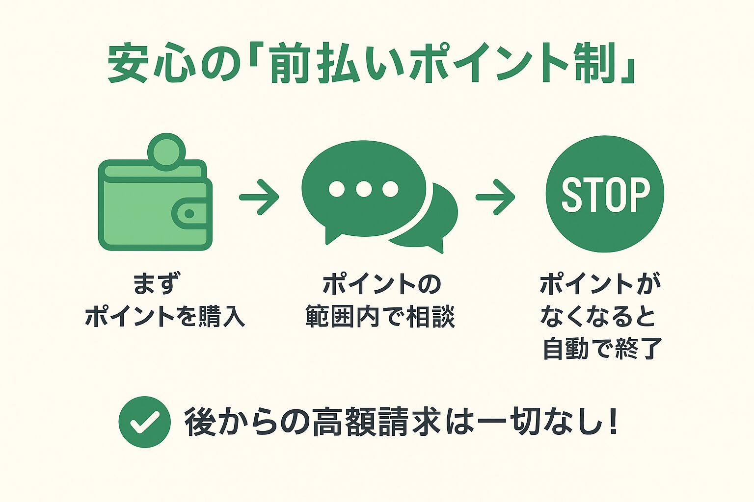 - 料金体系は透明なポイント制で、高額請求の心配がないこと。