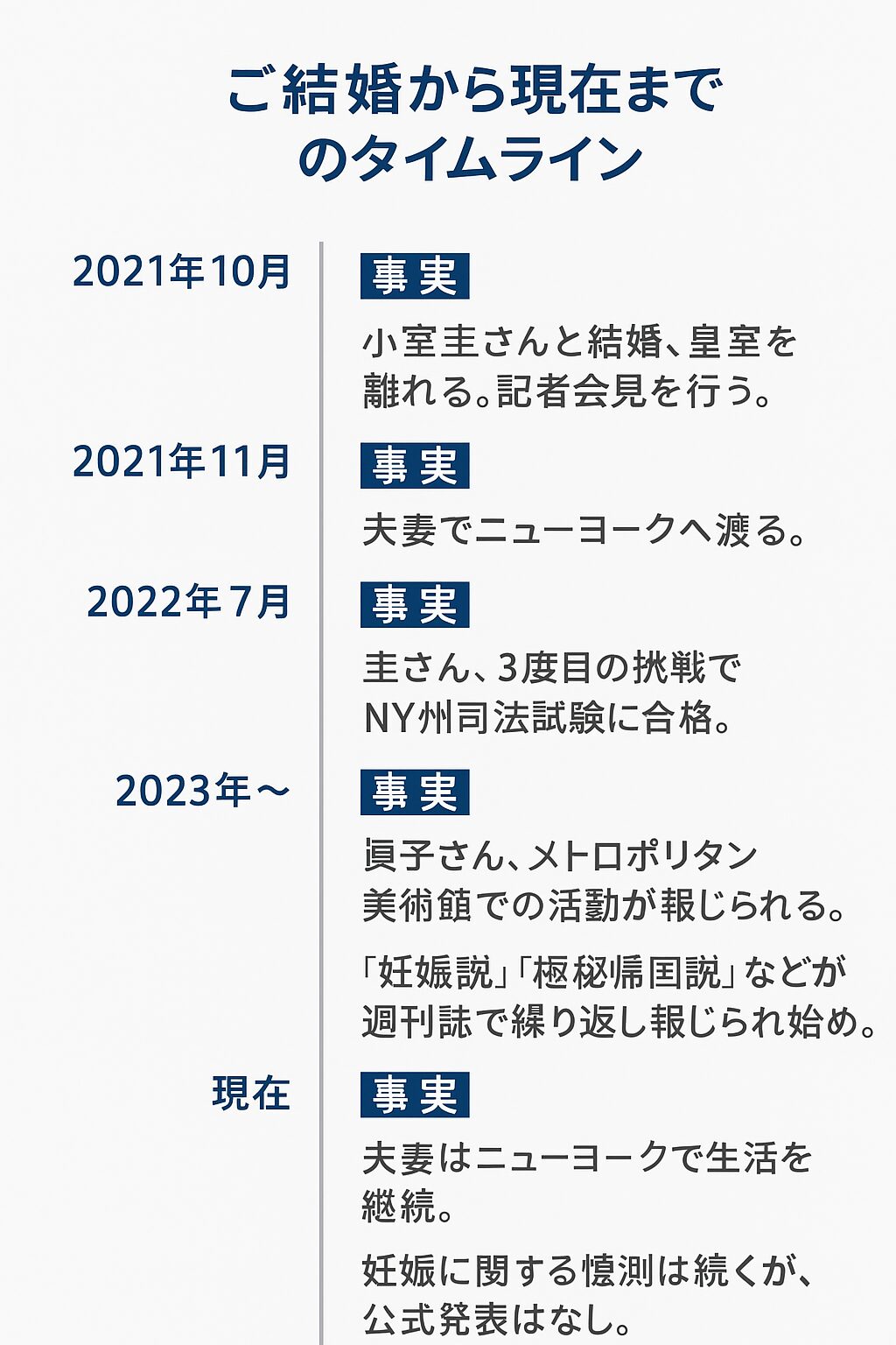 参考altテキスト: 小室眞子さん夫妻の結婚から現在までのタイムライン。司法試験合格や美術館での活動といった事実と、週刊誌で報じられた妊娠の噂を時系列で示している。