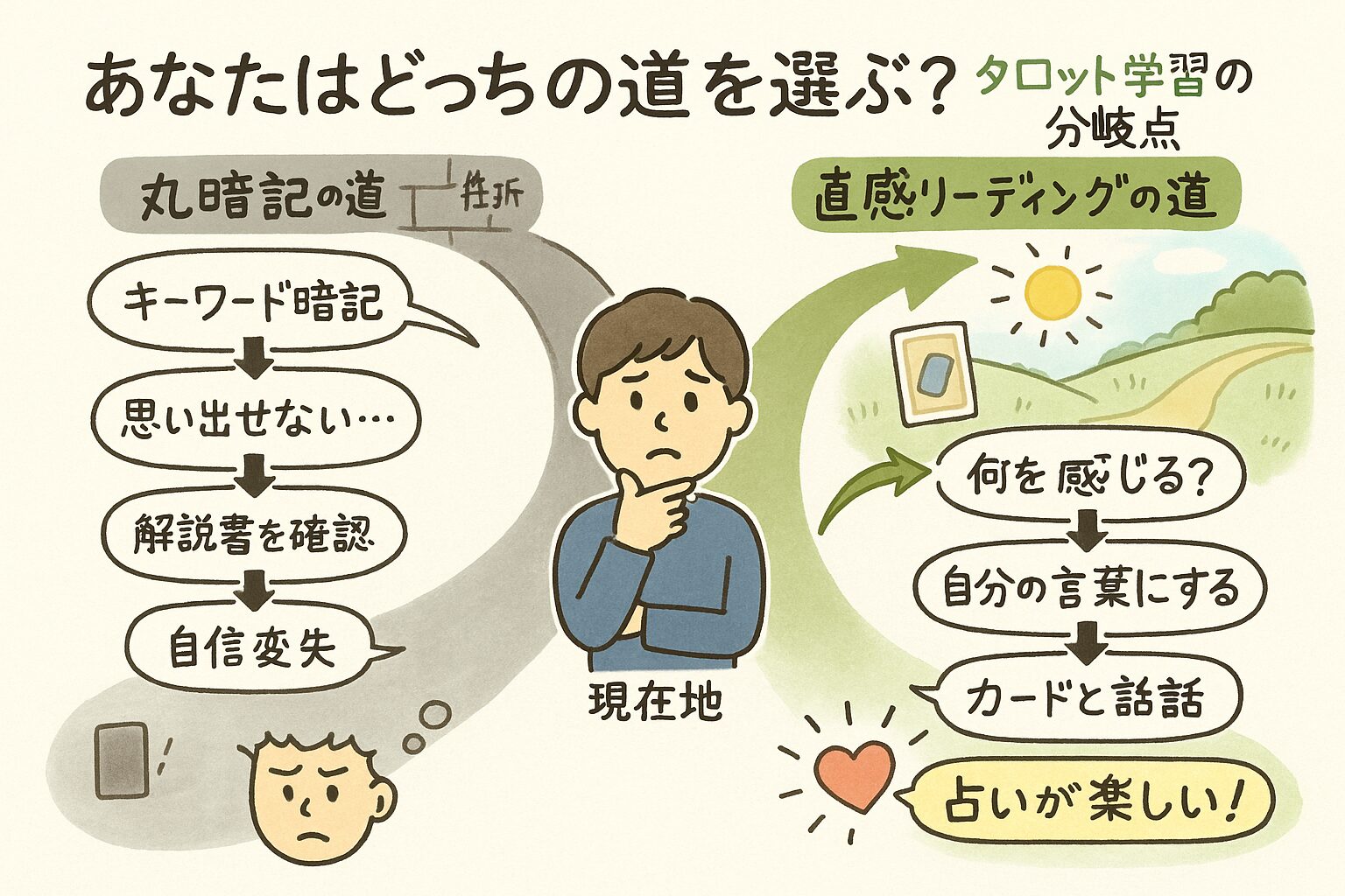 「タロットカード78枚の意味、覚えられなくて挫折しそう…」そんな風に感じていませんか?かつての私も同じでした。でも、ご安心ください。この記事では、タロットは記憶力テストではないこと、そして、暗記の苦しみからあなたを解放する「直感的リーディング」という、もっと楽しくて自由な方法があることをお伝えします。この記事を読み終える頃には、あなたもきっと、カードと“おしゃべり”するような感覚で、タロットともう一度向き合えるようになっているはずです。