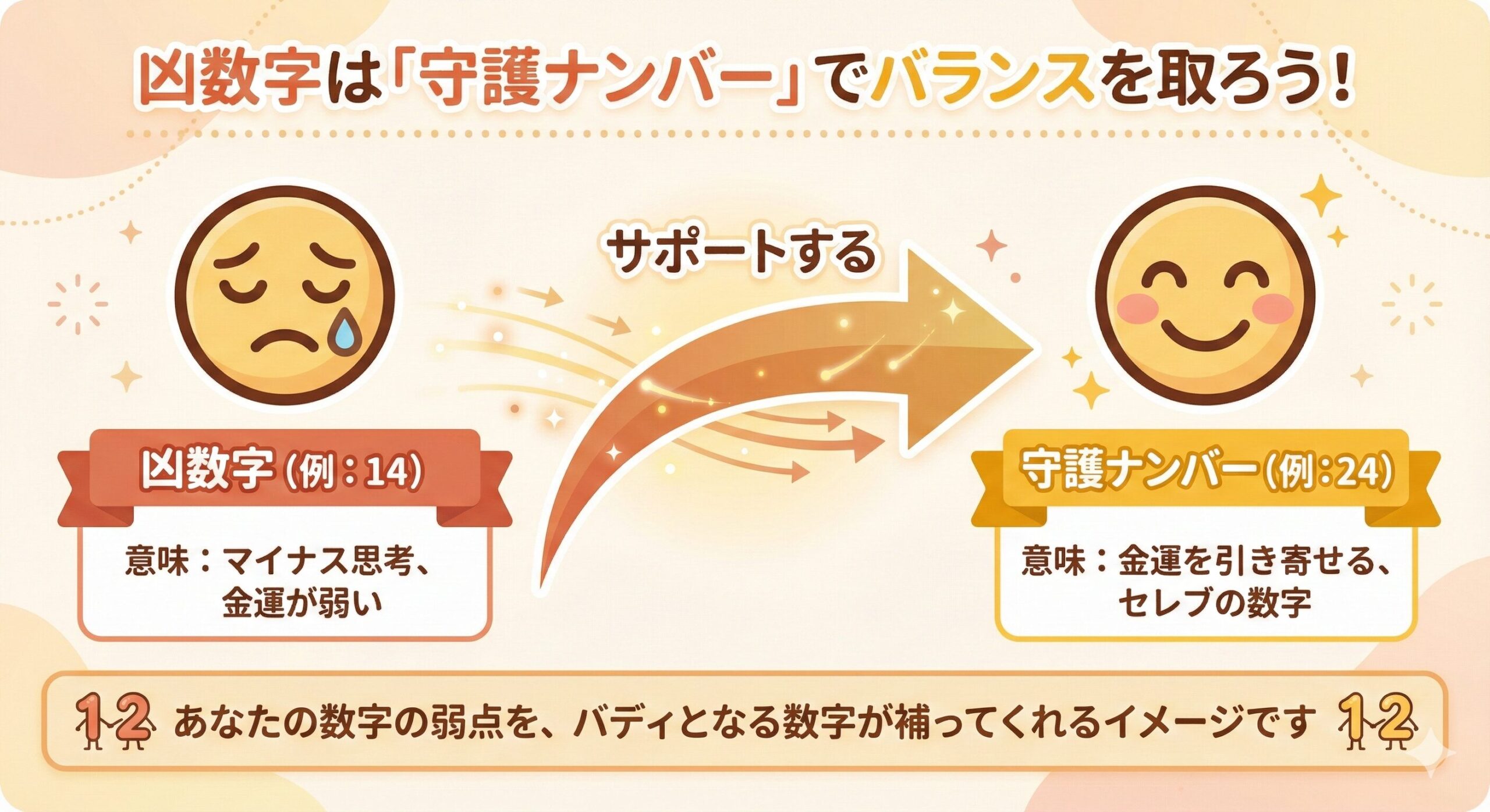つまり、凶数字と、その力を和らげる守護ナンバー(サポートナンバー)は、いわば弱点を補い合ってくれる「バディ」のような関係性なのです。例えば、「金運が弱い」という性質を持つ数字があったとしても、それをサポートする「金運を引き寄せる」数字を意識することで、バランスを取ることができる、と「数意学」では考えられています。