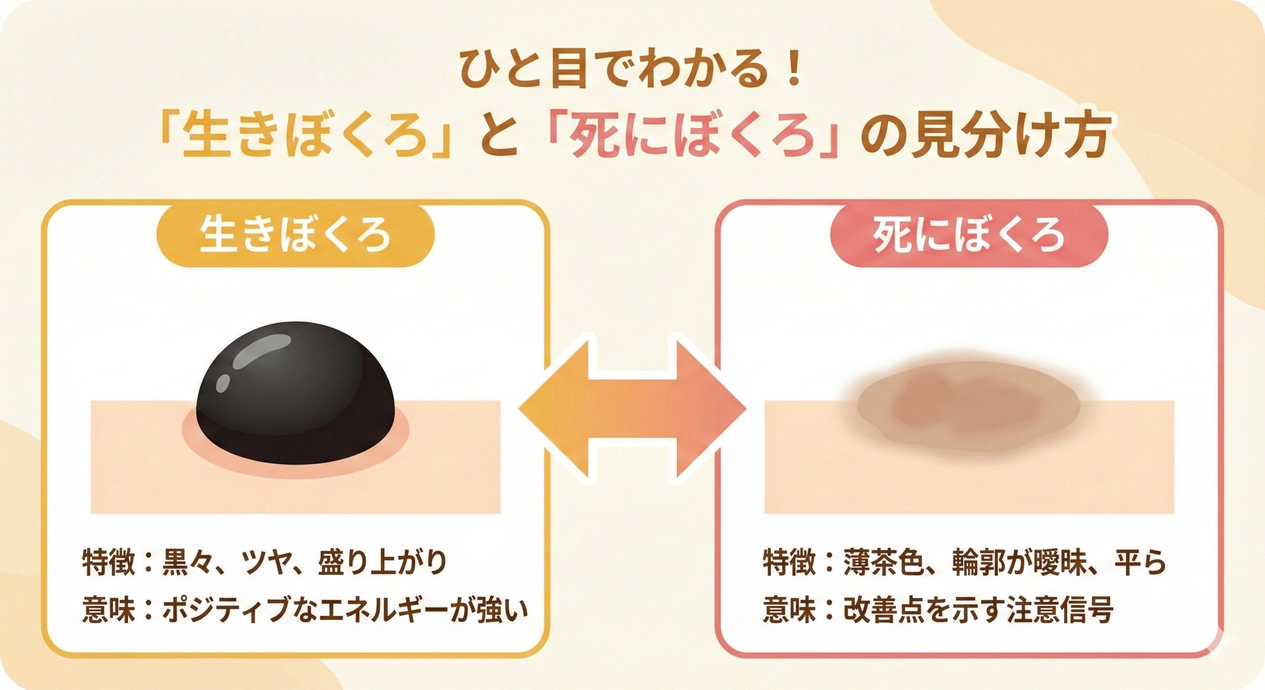 ほくろを解釈する上で基本となるのが、「生きぼくろ」と「死にぼくろ」という2つの分類です。同じ場所にあるほくろでも、このどちらのタイプかによって、意味合いが大きく変わってきます。