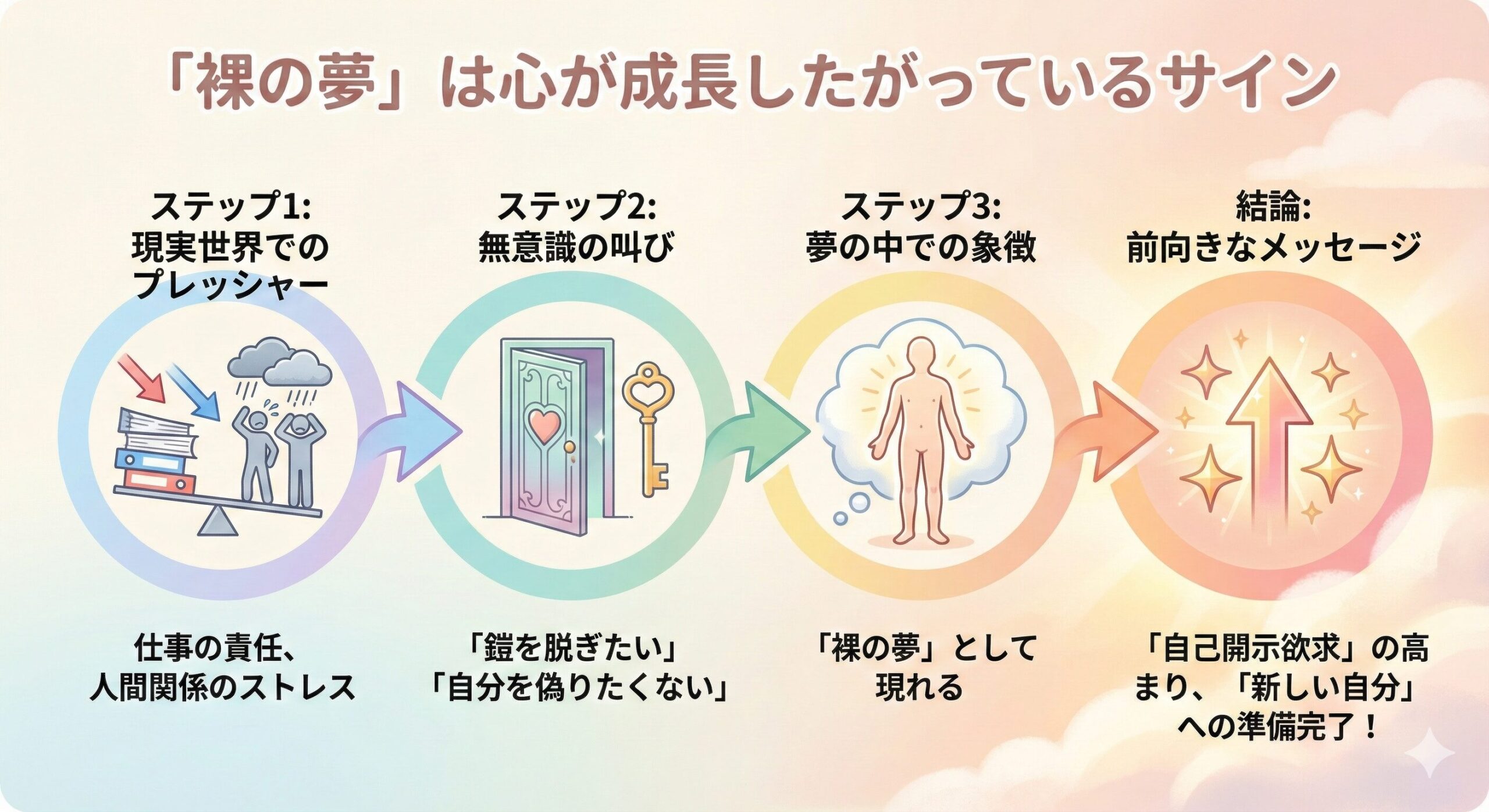 この現実世界での強いストレスや不安が原因となり、心の防衛機制が働かない睡眠中に「裸の夢」という結果として象徴的に現れることは、心理学的に珍しいことではありません。