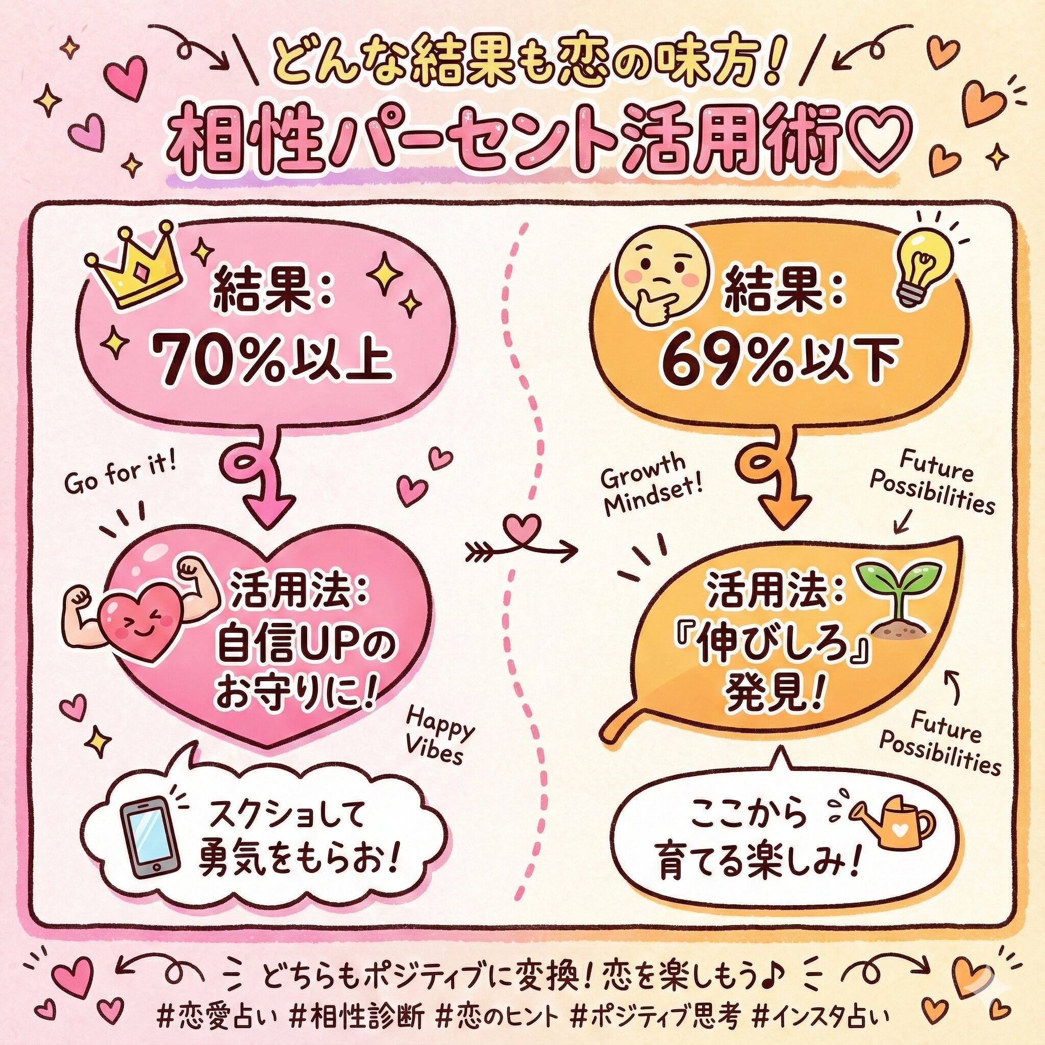 一番大切なのは、占いで出たパーセントを、一喜一憂するための数字じゃなくて、あなたの恋のお守りにして、次の一歩を踏み出すための勇気に変えること。相性診断は、そのためのきっかけなんだ。