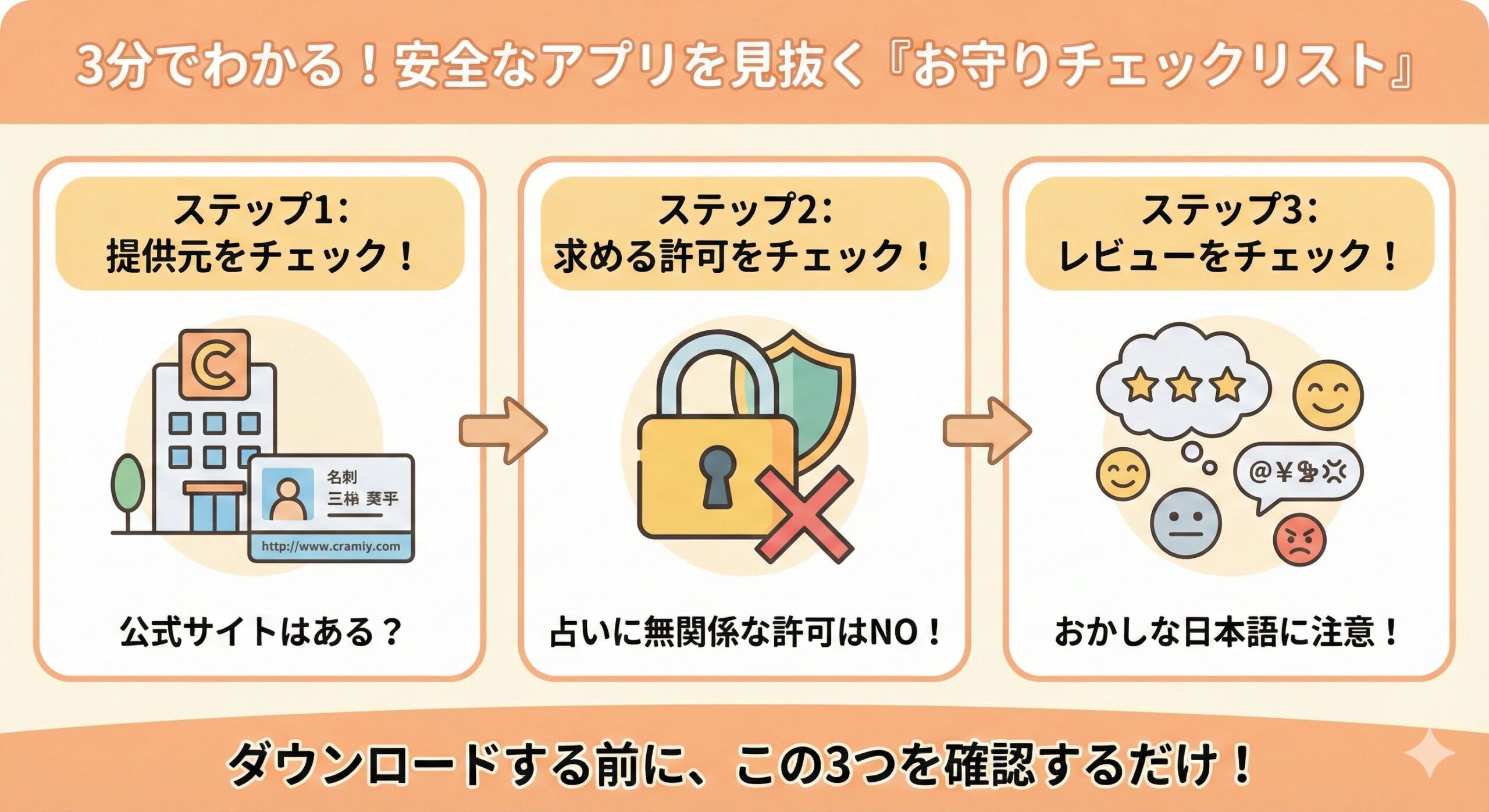 では、具体的にどうすれば安全なアプリを見分けられるのでしょうか。難しい専門知識は一切不要です。これからご紹介する3つのポイントを、アプリをダウンロードする前にチェックするだけで、リスクを大幅に減らすことができます。