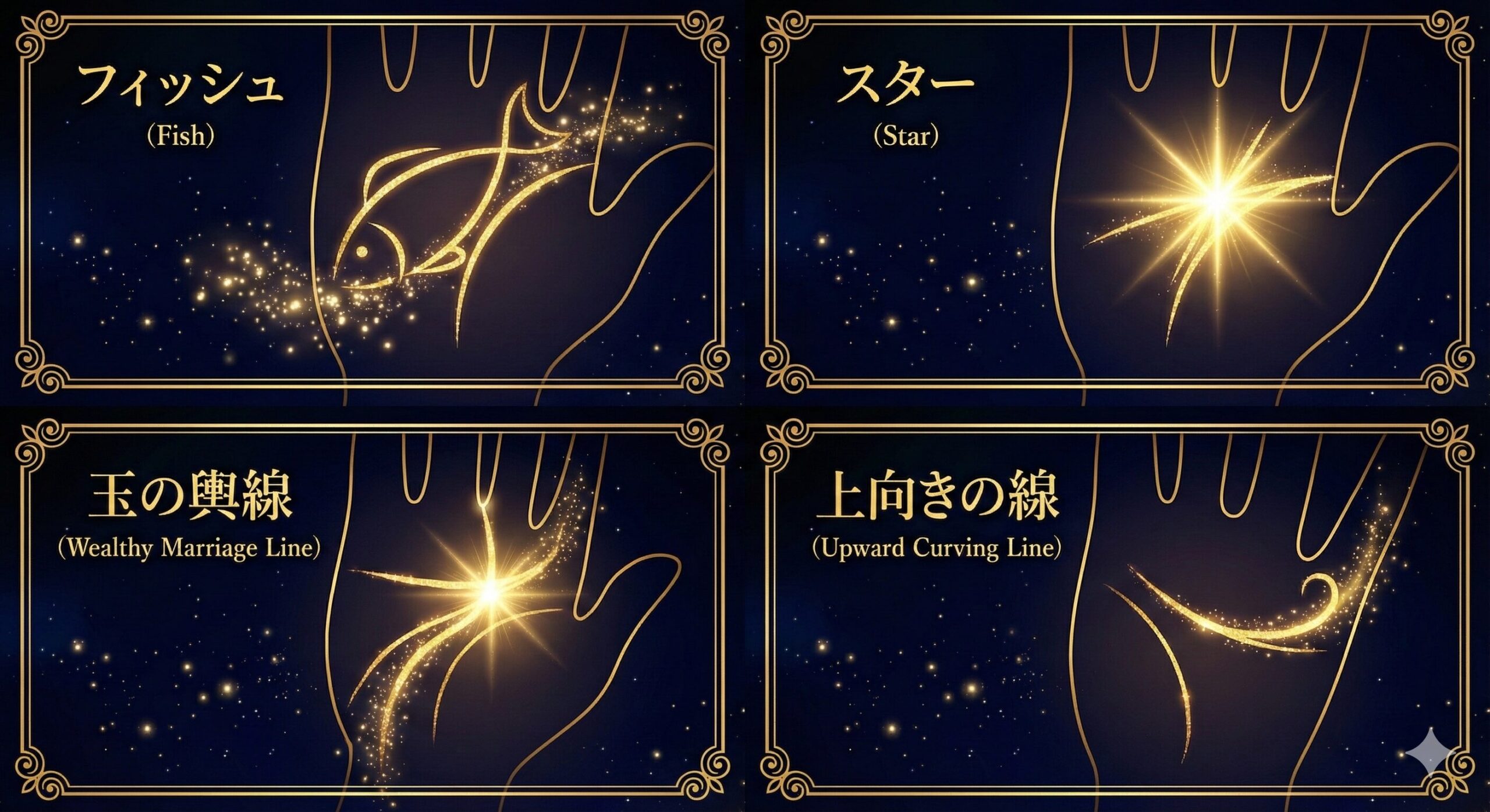 結婚線の先端や根本に、魚のような形が現れることがあります。これは予期せぬ幸運が訪れることを示す、非常に強力な吉相です。素敵な出会いやプロポーズが近いかもしれません。 - ✨ きらめく星「スター」