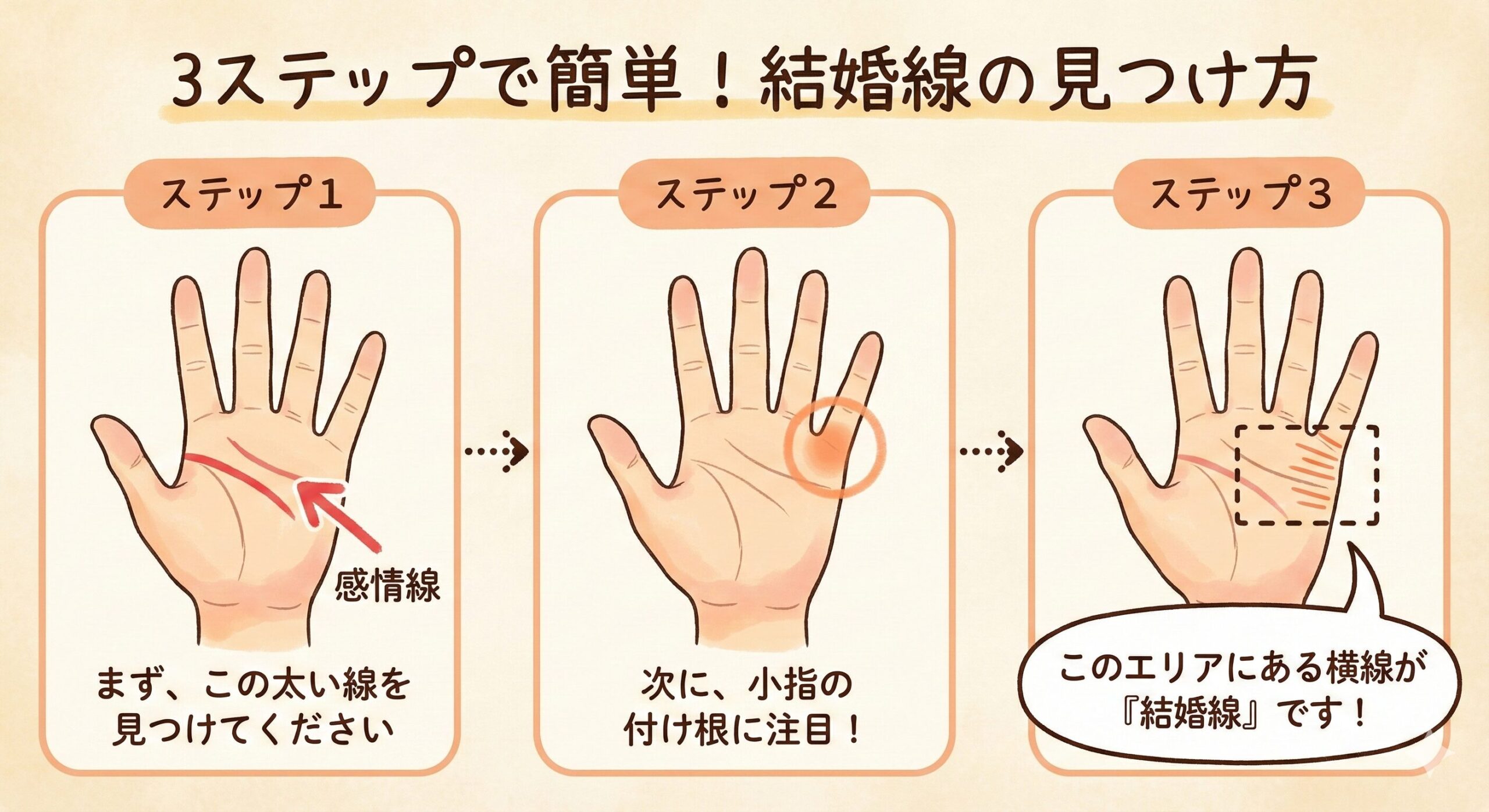 それでは、さっそくご自身の結婚線を探してみましょう。どこにあるかさえ分かれば、手相を見るのは決して難しくありません。以下の3ステップで、一緒に確認していきましょう。