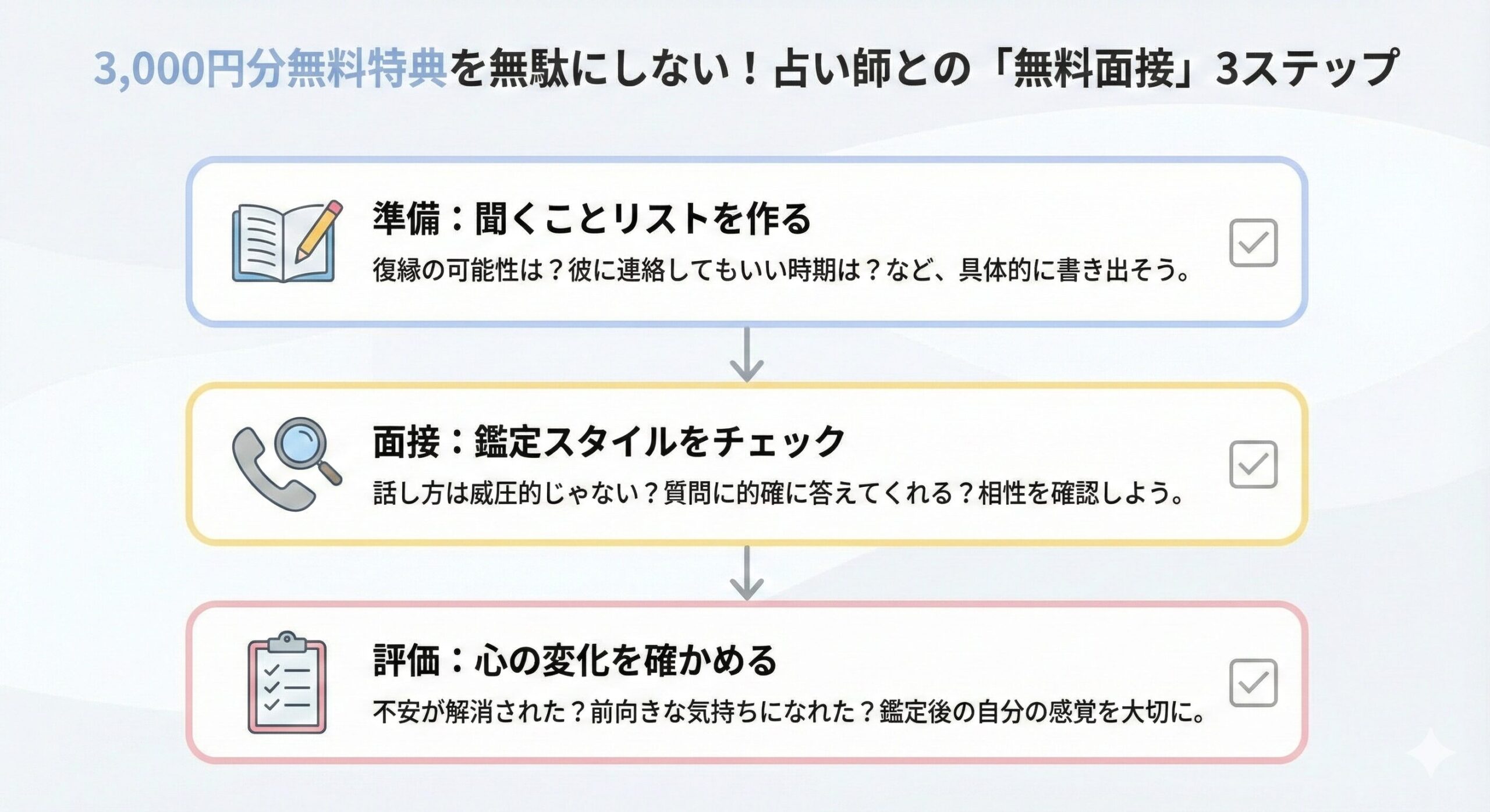 「でも、人気の先生が自分に合うとは限らない…」その通りです。だからこそ、初回3,000円分無料の特典を「本番の鑑定」ではなく、「最高の相談相手を見つけるための無料面接」として戦略的に使うのです。