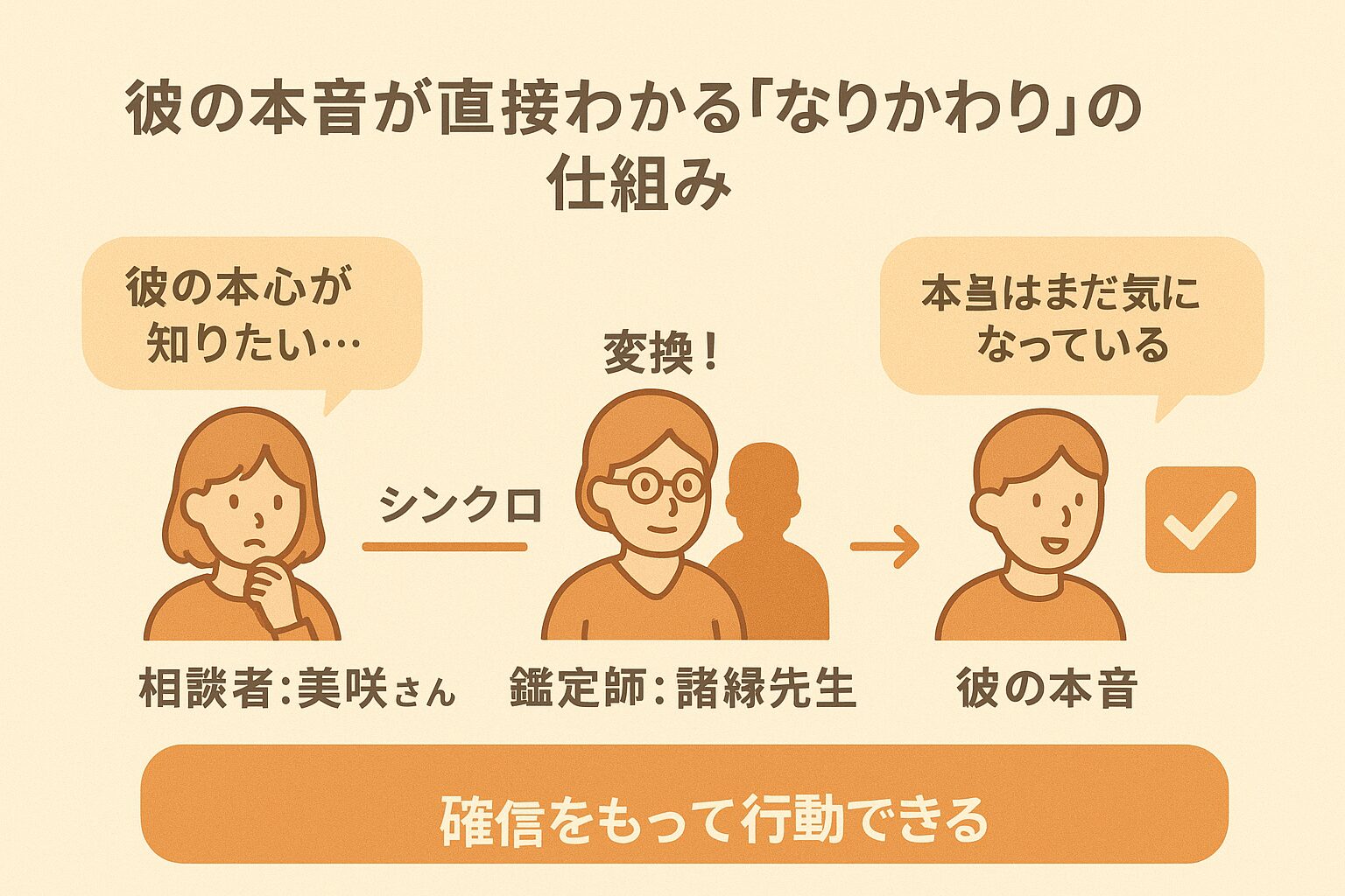 なぜなら、この点は多くの人が見落としがちで、一般的な占いが「彼の気持ちはこうでしょう」と翻訳して伝えるのに対し、「なりかわり」は彼の生の声を直接聞けるような体験だからです。多くの相談者様が「本当に彼がそこにいるみたいだった」と涙ながらに報告してくださるのが、諸縁先生の鑑定の最大の特徴です。この知見が、あなたの成功の助けになれば幸いです。