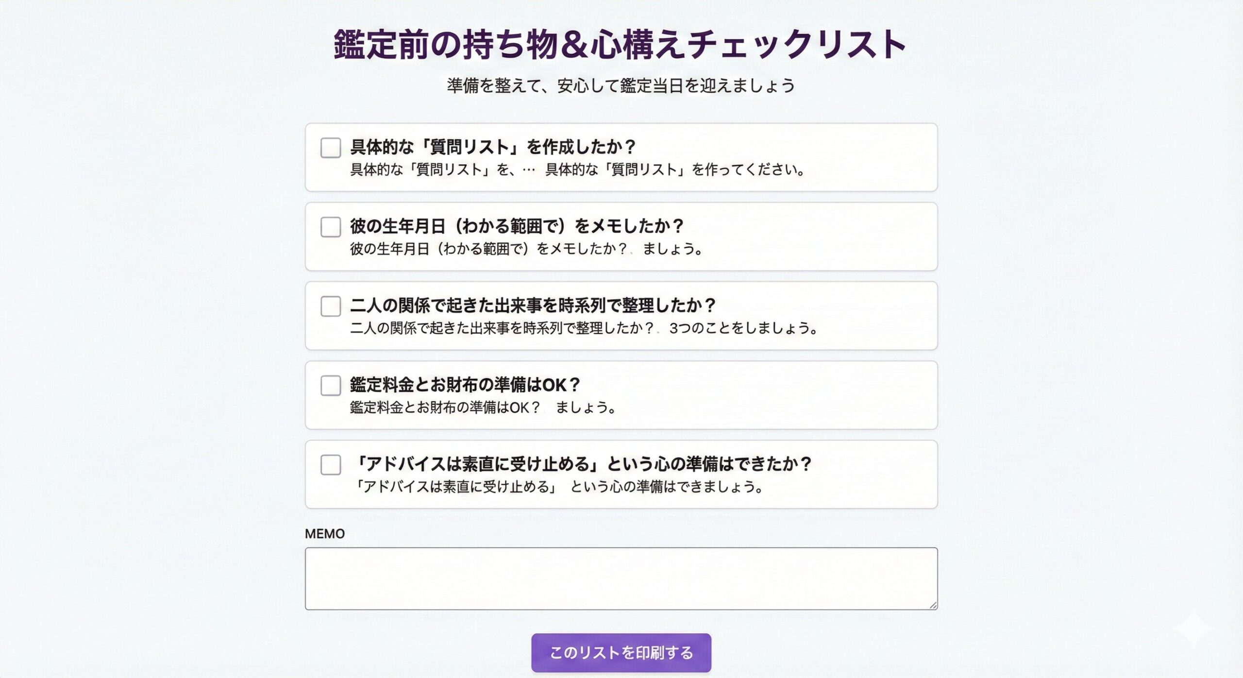 - 鑑定の効果は、「具体的な質問リスト」という事前準備で最大化されること。