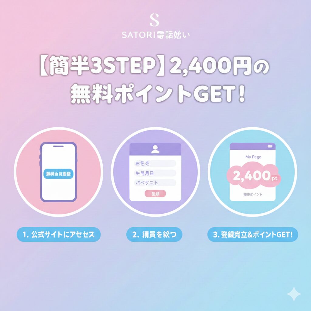 この初回無料特典という機能は、SATORI電話占いのサービスにおける、初心者の利用ハードルを下げるための重要な入り口です。具体的には、新規会員登録をするだけで2,400円分のポイントがもらえ、このポイントを使って鑑定を試すことができます。