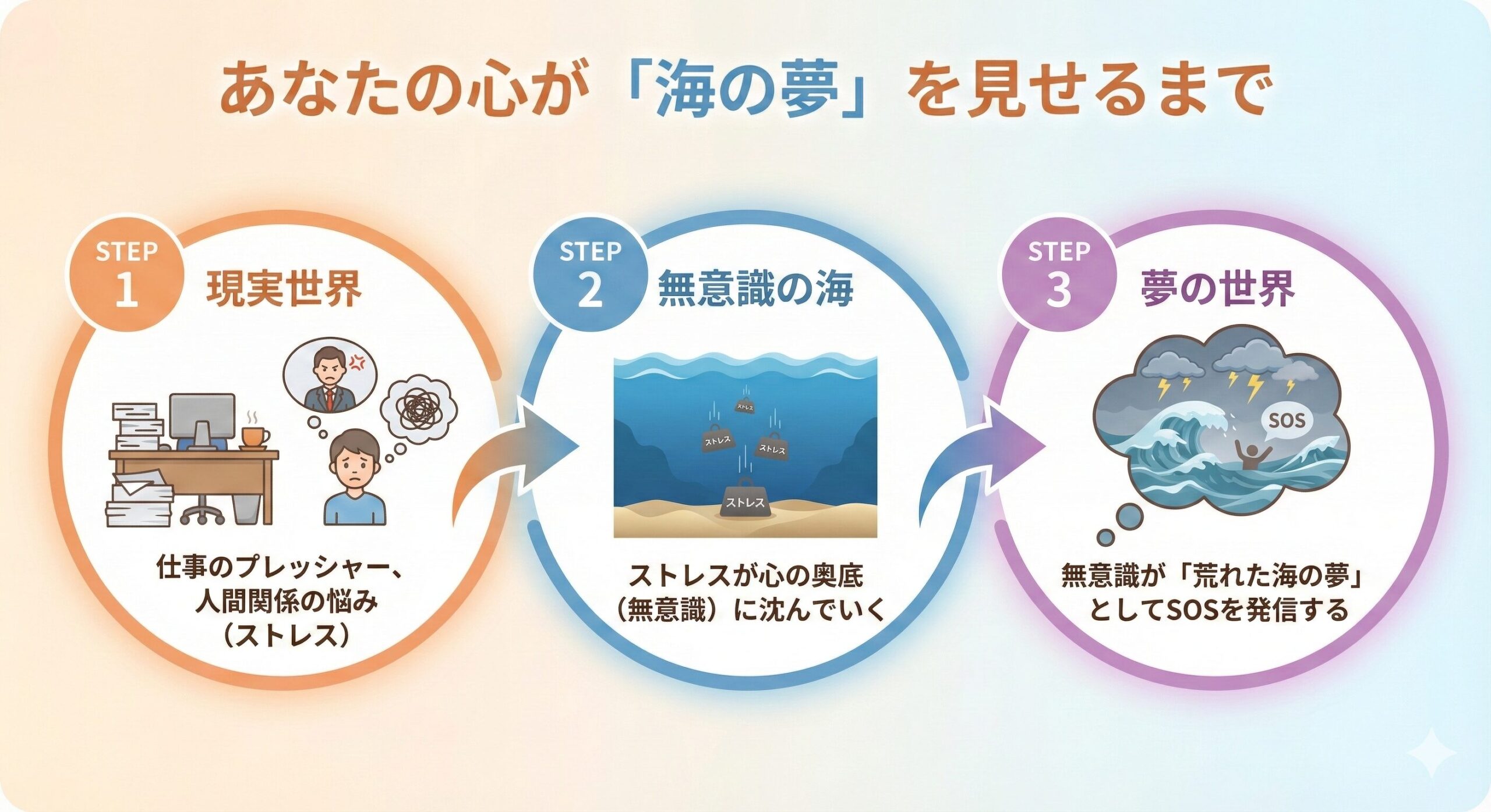 しかし、心理学的に見れば、過度なストレスが、心のSOSサインとして警告夢を見せる原因となることは広く知られています。つまり、夢とストレスは密接に関係しているのです。日中に感じているプレッシャーや人間関係の悩み、将来への不安といったストレスを、眠っている間に心が整理しようとします。その心の働きが、「荒れた海」や「溺れる」といった少し刺激の強い映像として、警告夢に現れるのです。