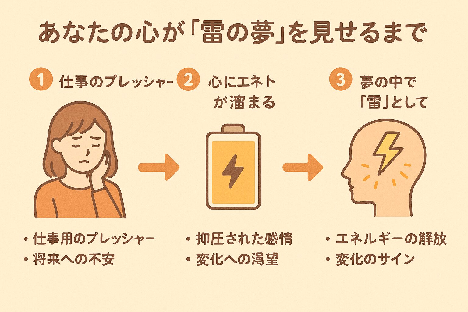 それでは、あなたの心は「雷の夢」を通じて、具体的に何を伝えようとしているのでしょうか。心理学的に分析すると、そこには大きく3つの重要なメッセージが隠されています。多くの場合、夢の中の雷は、あなたが現実世界で感じているストレスや不安といった、内面に抑圧されたエネルギーが象徴的に現れたものなのです。