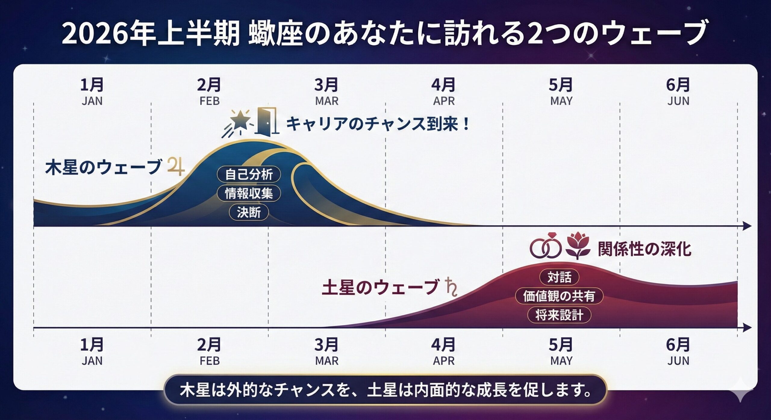 2026年上半期、星々はあなたに素晴らしい機会と、自分自身と深く向き合う時間を与えてくれます。拡大の星・木星がキャリアの扉を開き、安定の星・土星があなたの人生の基盤を固めるよう促しています。