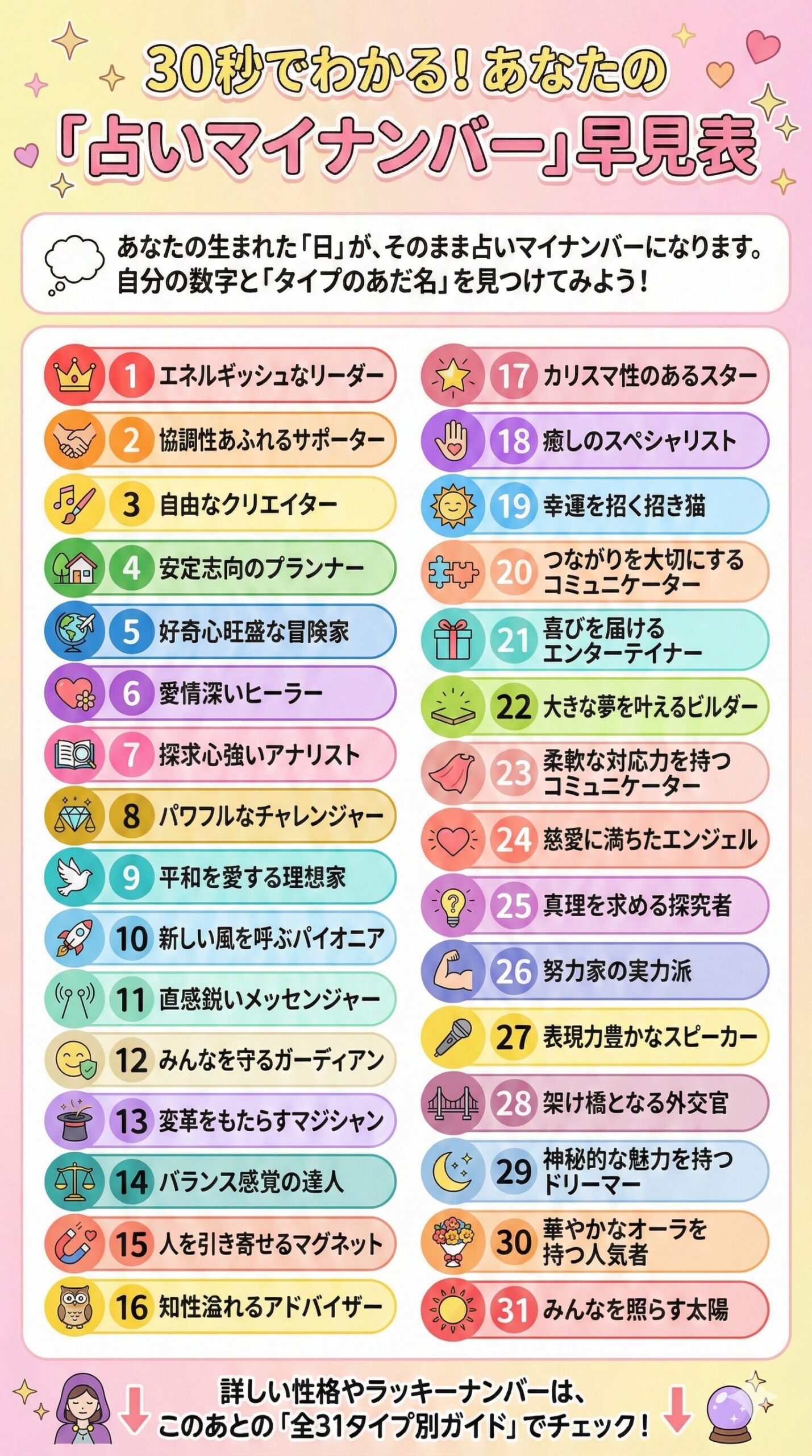早見表でご自身のタイプが確認できましたか?ここからは、それぞれの占いマイナンバーが持つ、より詳しい意味を解説していきます。ご自身の基本的な性格や隠れた才能、そして運気をアップさせてくれるラッキーナンバーとラッキーカラーをチェックしてみてください。