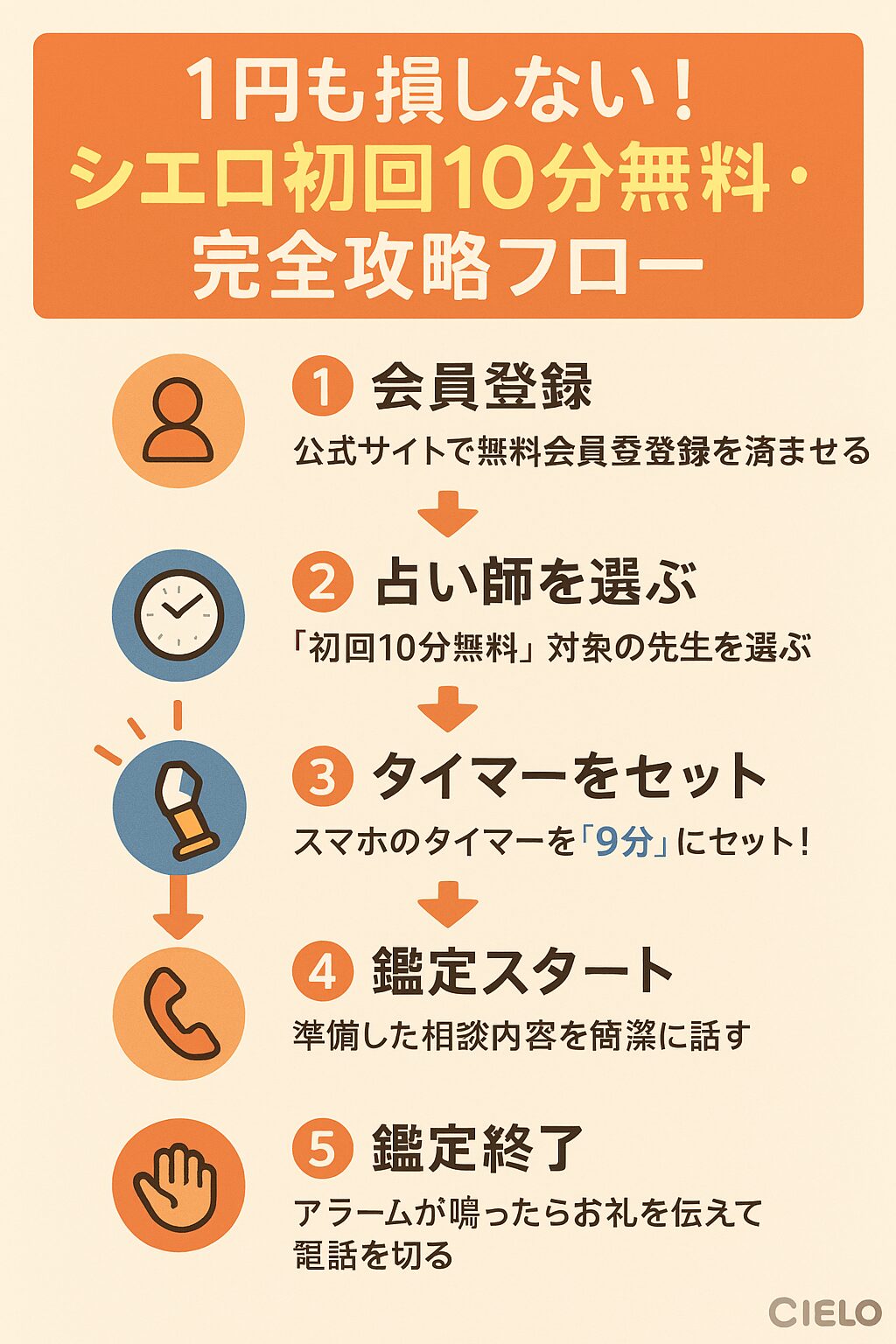 この記事では、電話占いシエロの初回無料特典を、初心者のあなたが1円も損せず安全に試すための方法を解説してきました。