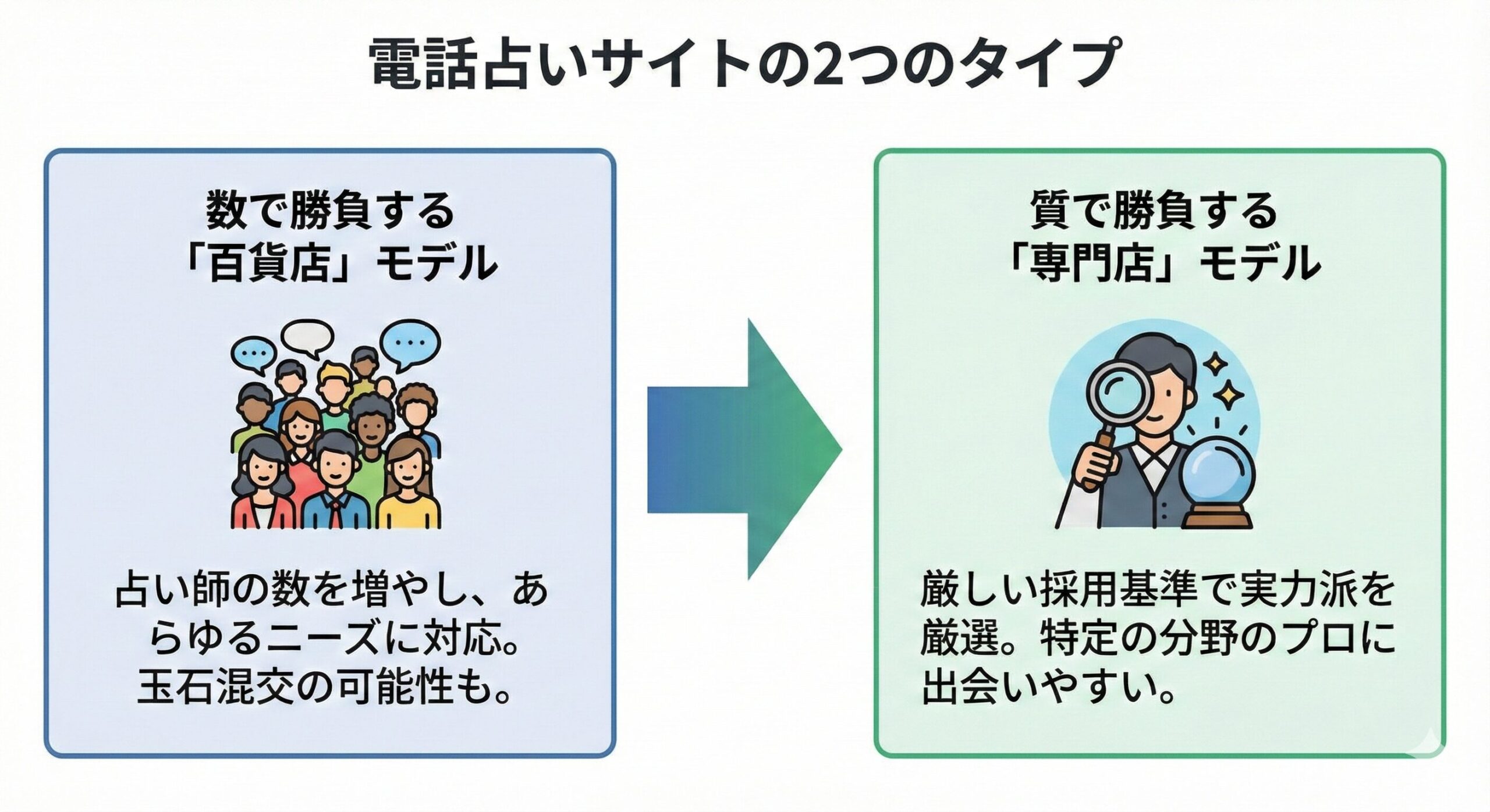 その理由は、電話占いコメットが他の多くの電話占いサイトとは異なり、「占い師の質」と、その質をユーザー自身が「見極めやすいシステム」という2つの点で明確な差別化を図っているからです。
