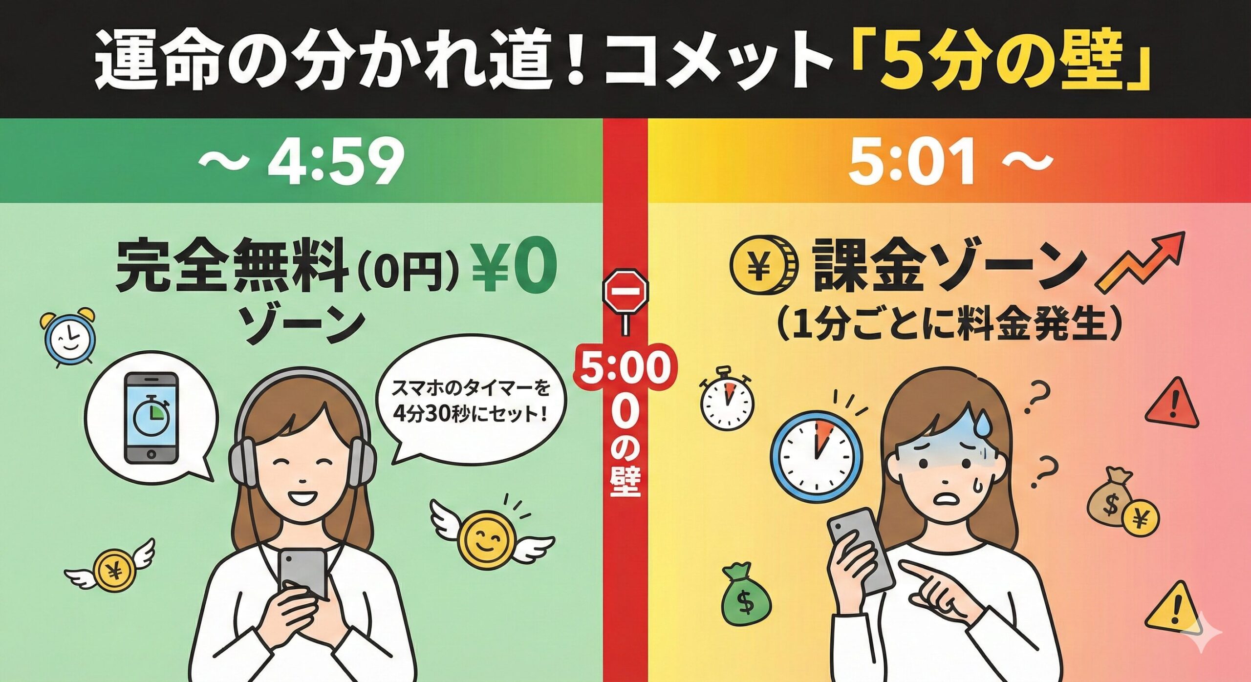 でも、一番気になるのは「本当にタダなの?」「5分過ぎたらどうなるの?」ってことだよね。ペルソナの不安の最大の原因である料金体系について、徹底的に解剖するから安心して!