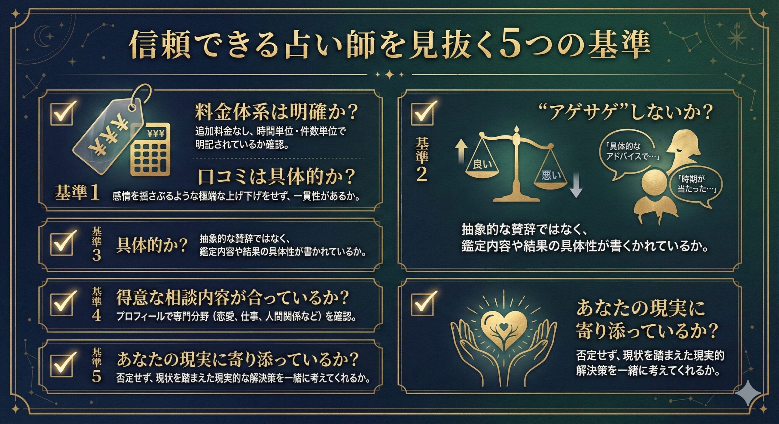 【結論】: 「当たるか」よりも「相談後に、あなたが前向きな気持ちで具体的な一歩を踏み出せるか」を基準にしてください。
