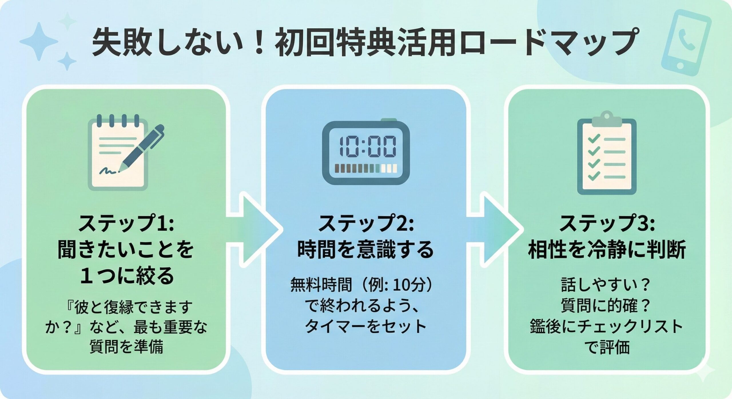 ここが最も重要なポイントです。電話占いフィールには、初めて利用する人向けの初回無料特典があり、これがあなたの金銭的な料金負担のリスクを大幅に軽減します。この特典は、単にお得というだけでなく、あなたが有料で鑑定を依頼する前に、占い師との相性を「面接」するためのものだと考えてください。この「お試し鑑定」を成功させるための具体的な3ステップを解説します。