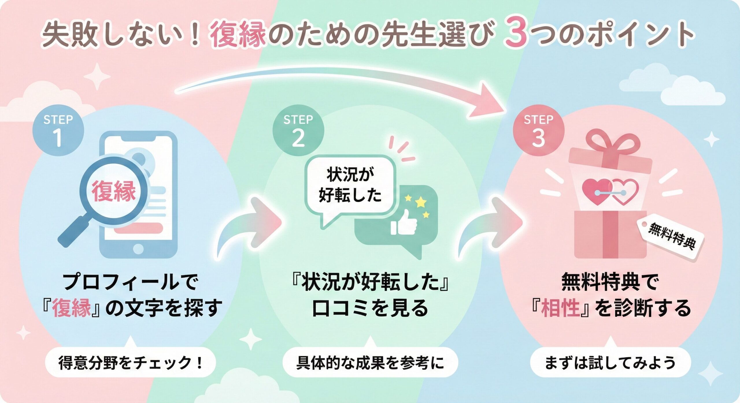 では、具体的にどうすれば、あなたにぴったりの先生を見つけられるのでしょうか。情報が溢れていると混乱してしまいますから、ここでは復縁の悩みを抱える初心者のために、重要なポイントを3つだけに絞って解説します。