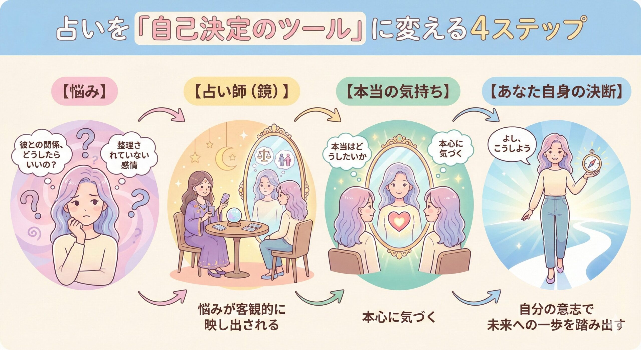 この心構えは、占い師とあなた自身の関係性を正しく理解することにつながります。占い師は、あなたの人生の決定権を握る存在ではありません。占い師の役割は、あくまであなたの自己決定を支援するサポーターです。タロットカードや霊感といったツールを使い、あなた自身も気づいていない深層心理や、彼との関係性の本質を客観的に映し出す「鏡」のような存在だと考えてください。
