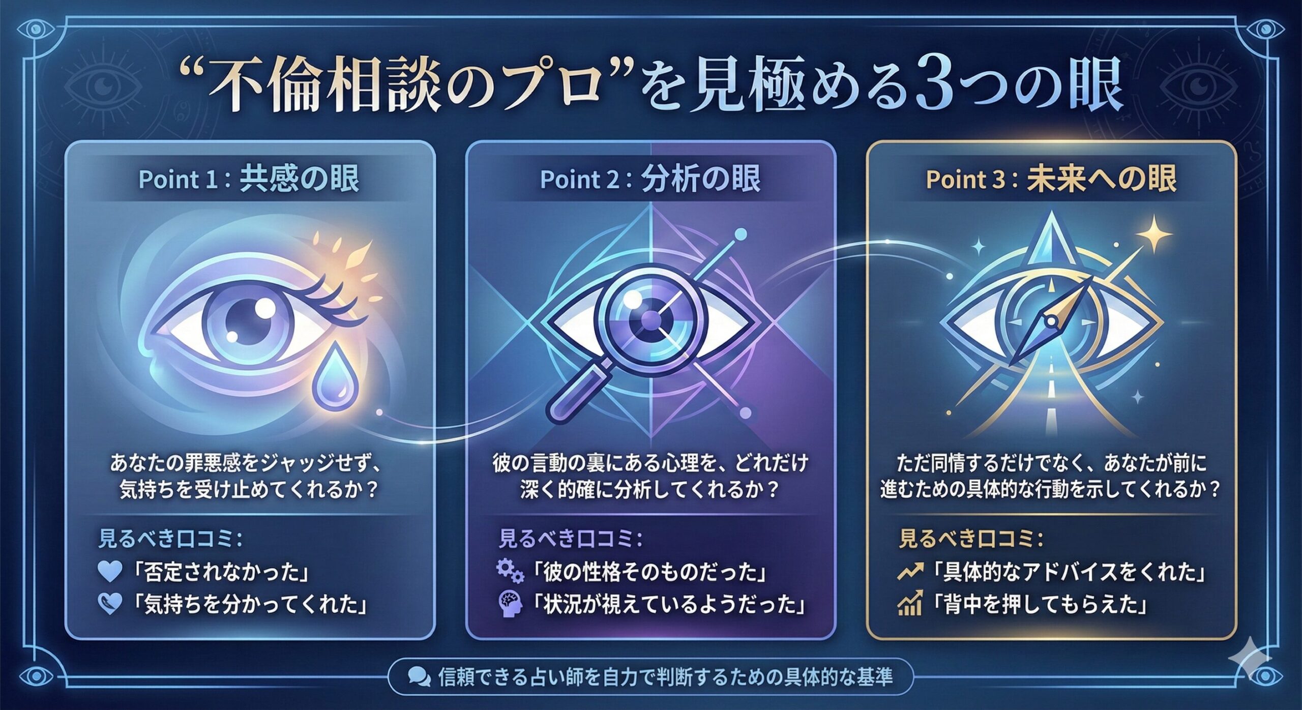 では、どうすれば「本物の専門家」を見極められるのでしょうか。このトピックはあなたのお金と人生に関わるYMYL領域です。だからこそ、ネット上の口コミ・評判を鵜呑みにせず、以下の3つの基準で占い師を「評価」する視点を持ってください。