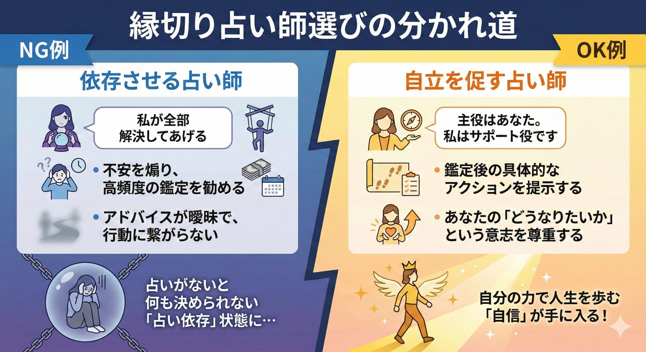 縁切りで使われる占術には、霊感霊視や波動修正など、様々な種類があります。これらは優劣ではなく、アプローチの違いです。例えば、相手の執着が強い場合は、相手の意識に働きかける「思念伝達」が得意な先生が良いかもしれません。一方、あなた自身の心が弱っている場合は、乱れたエネルギーを整える「波動修正」で、まずあなた自身を癒すことが先決です。自分の状況を説明した際に、なぜその占術が必要なのかをきちんと説明してくれる占い師を選びましょう。 - アフターフォローの視点:あなたの「自立」を促してくれるか