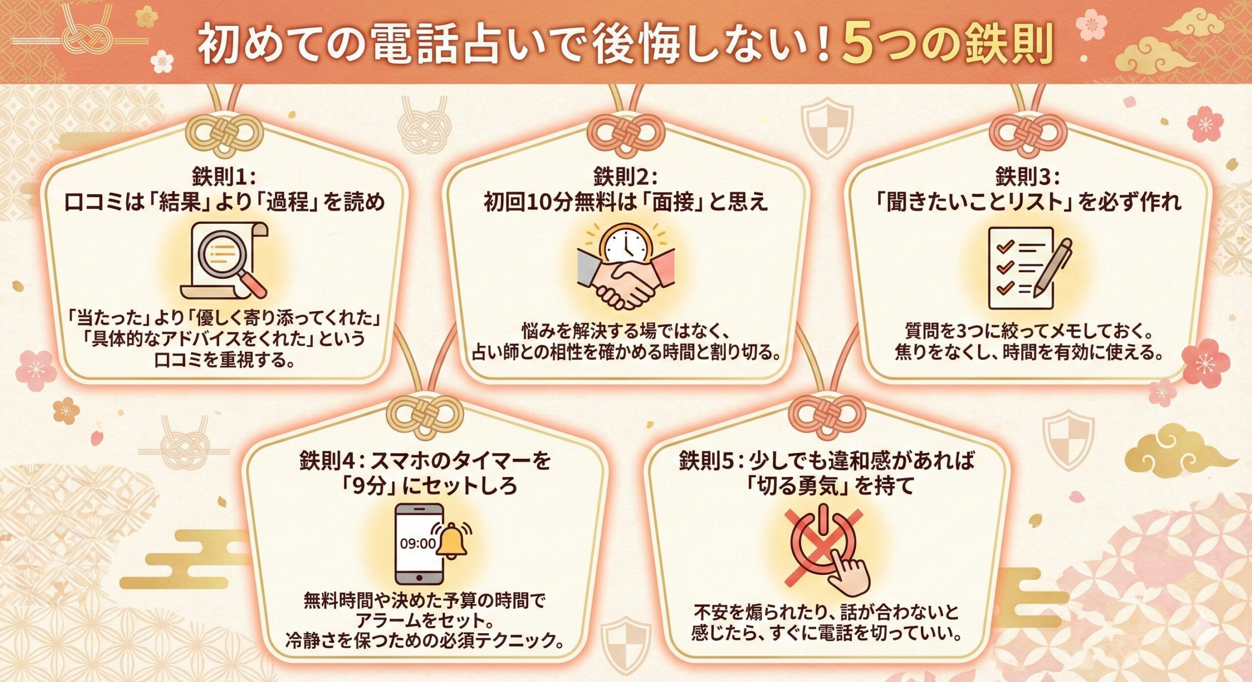 ここまで読んだあなたは、もう広告の言葉に無防備に揺さぶられる初心者ではありません。電話占い業界のリスクを理解し、自分を守るための5つの自己防衛策を学び、自分自身の軸で占い師を選ぶ視点も手に入れました。