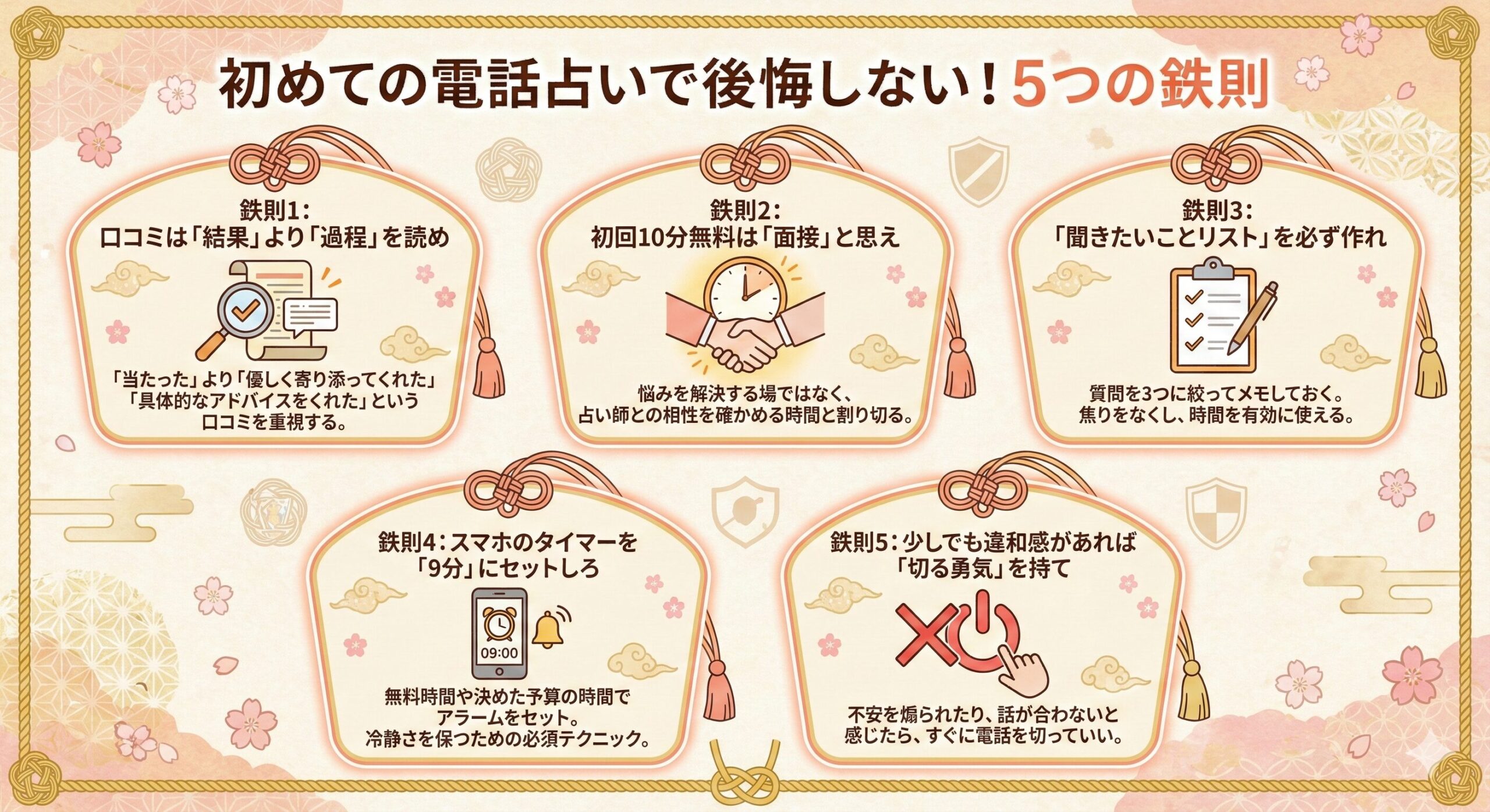 ここまで読んだあなたは、もう広告の言葉に無防備に揺さぶられる初心者ではありません。電話占い業界のリスクを知り、自分を守るための5つの自己防衛策を学び、自分自身の軸で占い師を選ぶ視点も手に入れました。