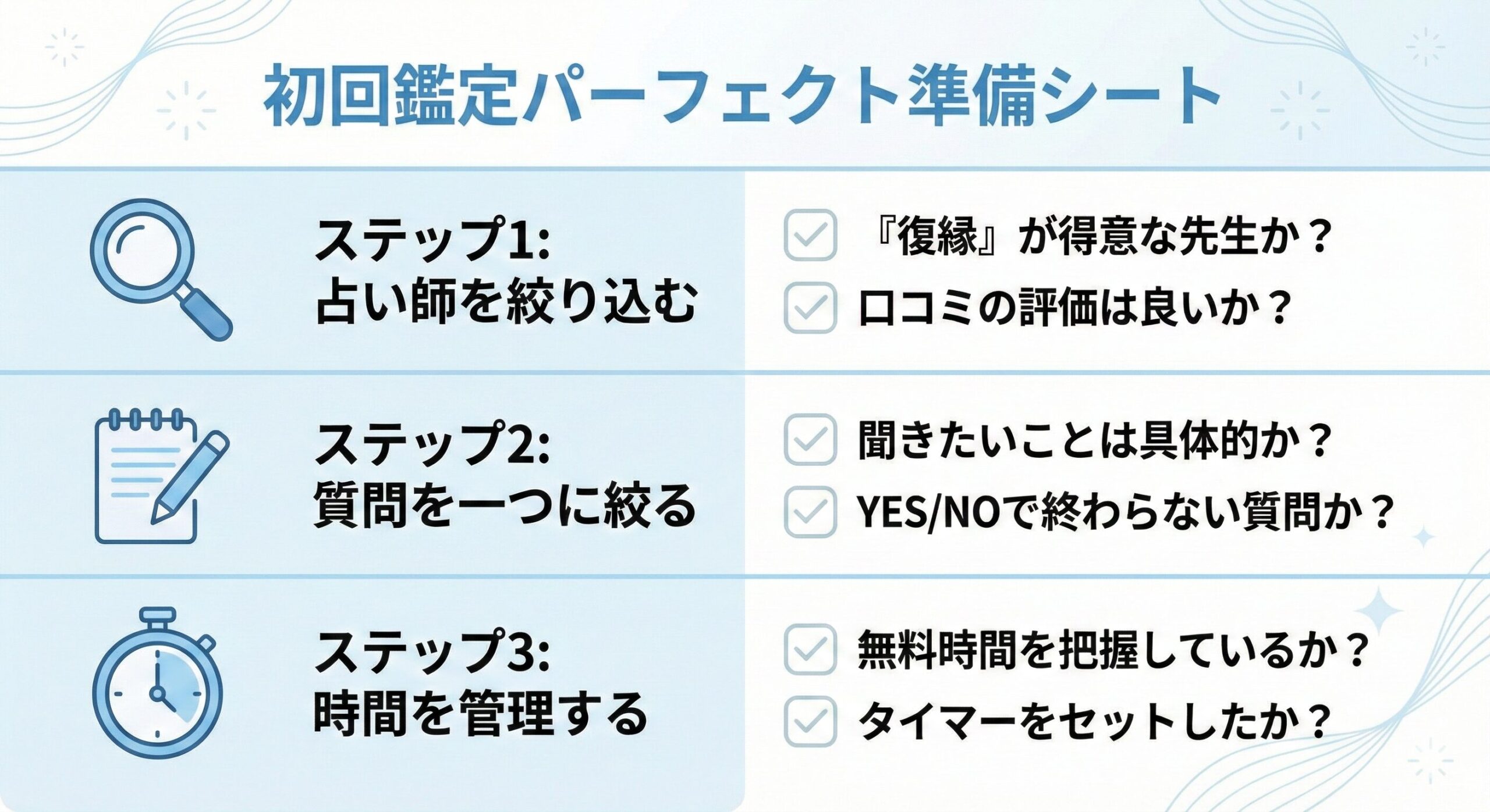 さあ、「3ステップ準備術」を片手に、あなたの復縁の悩みに光を当ててくれそうな占い師を探しに行きませんか?