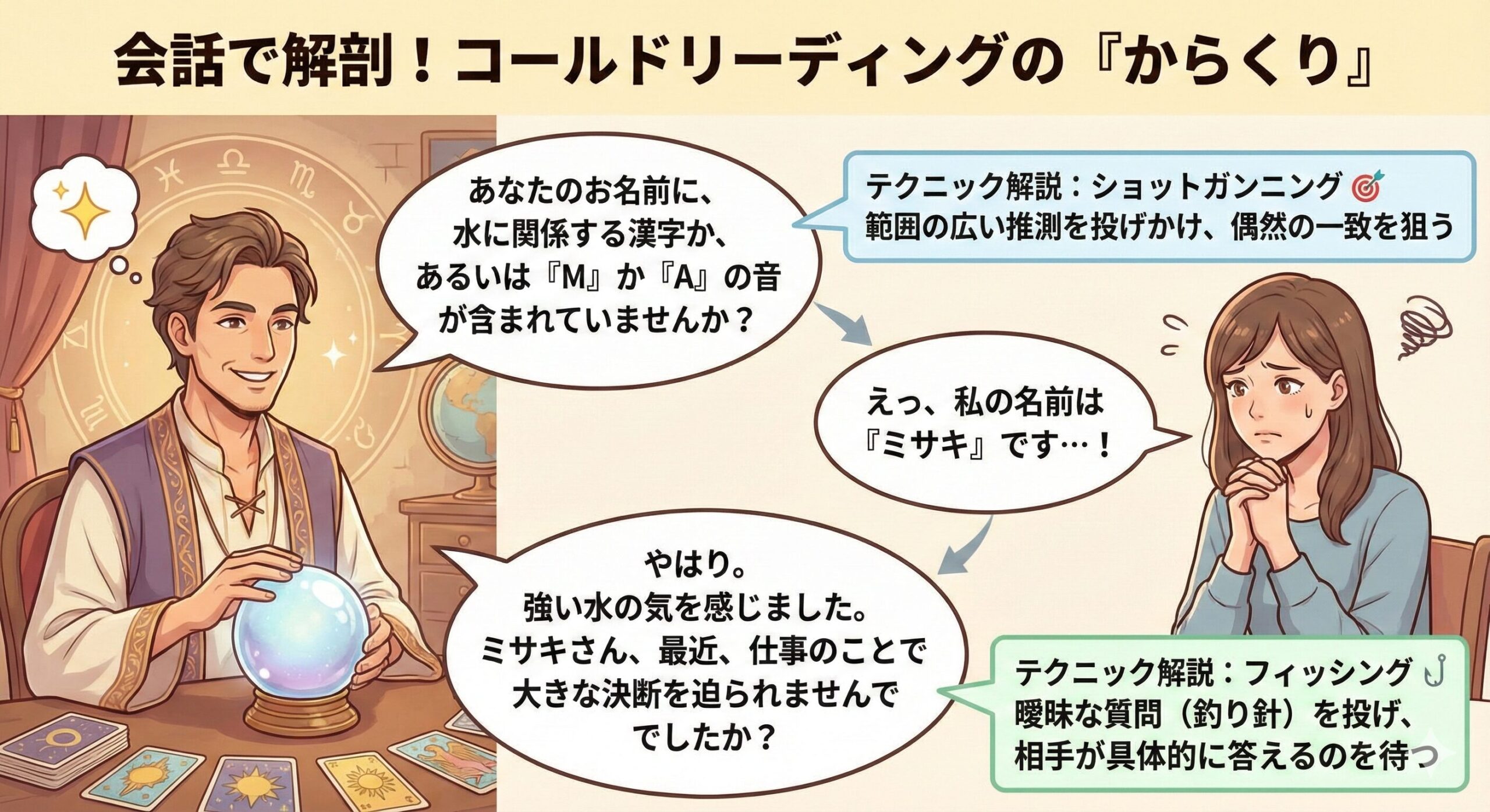 この記事では、超能力や霊感といった非科学的な話は一切しません。その代わり、認知心理学者である私が、占い師が使う心理テクニックを、具体的な会話のスクリプト(台本)を交えて、誰にでも分かるように論理的に解剖していきます。