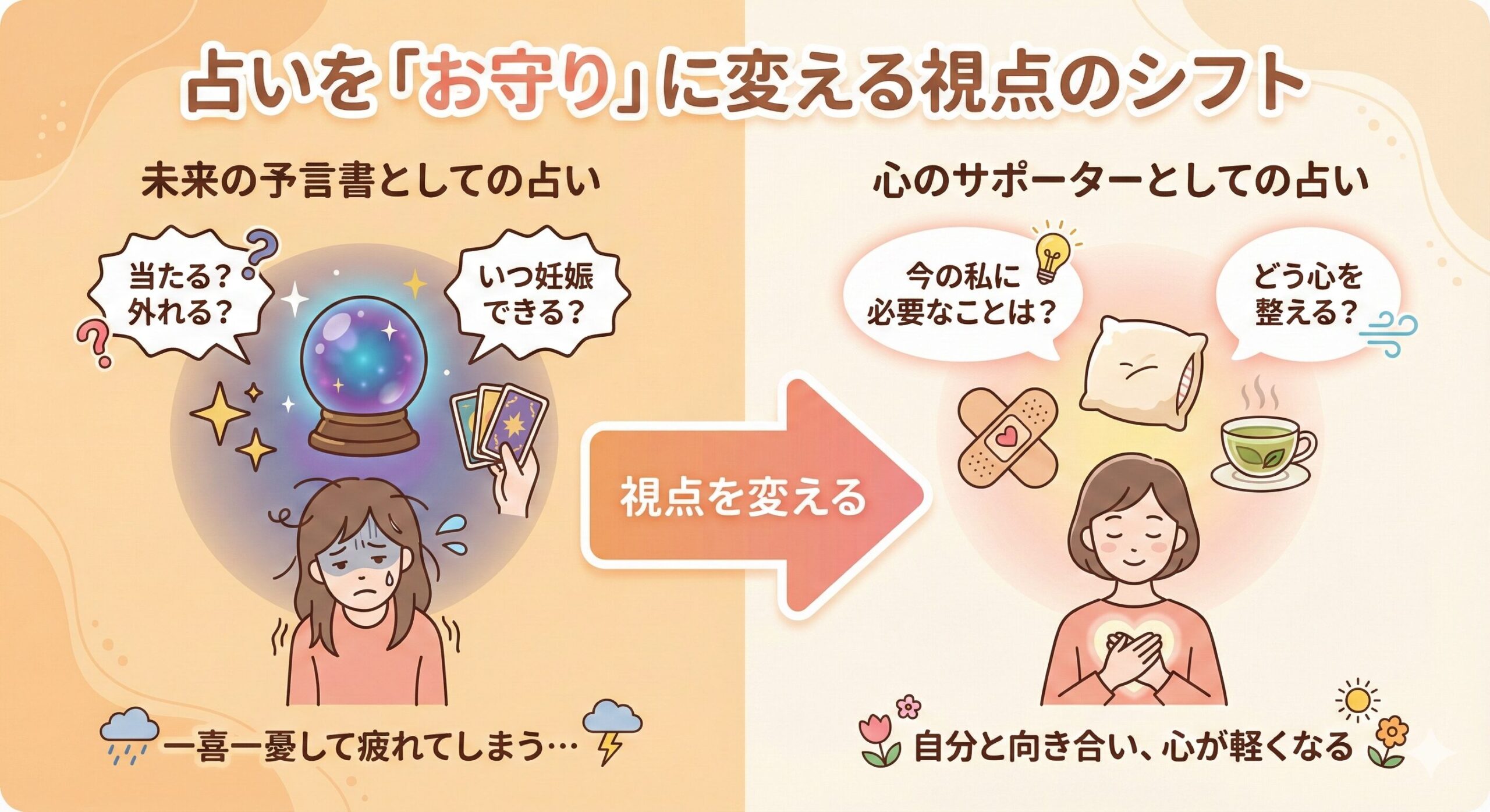 この記事を読めば、占いを「未来の決定書」ではなく、あなたの心をそっと支える「お守り」として活用する方法がわかります。単なる占い紹介ではなく、臨床心理士の視点から、医学的な妊活と両立させながら、心の平穏を取り戻すための具体的なヒントをお伝えします。