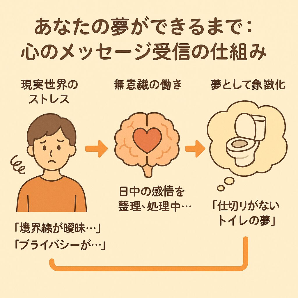 そもそも夢というものは、唐突に意味もなく現れるわけではありません。多くの場合、日中に感じたストレスや心の動きが原因となり、睡眠中に脳が情報を整理する過程で「夢」という形で現れます。 つまり、仕切りがないトイレの夢は、ゆうかさんの心が現実世界で感じていることを、別の形で表現してくれている、ごく自然な心の働きなのです。