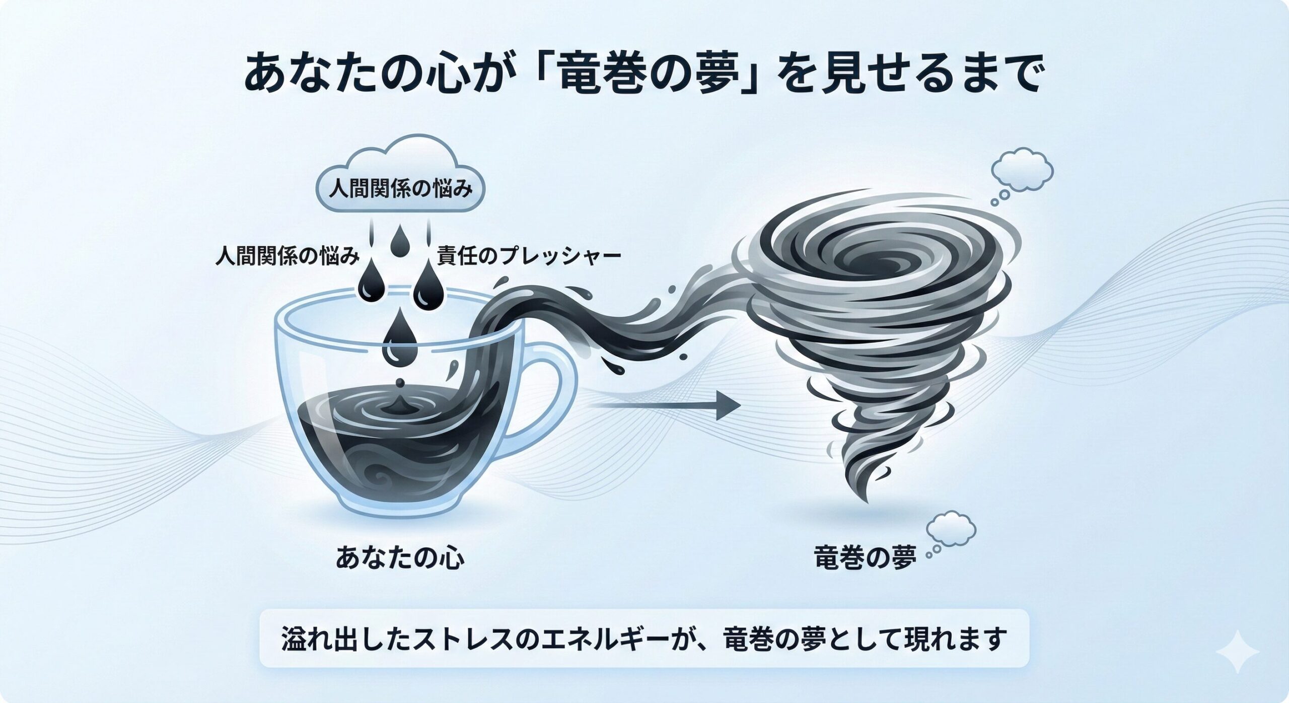 強烈なストレスを感じている時に、竜巻のような破壊的な夢を見ることは、心理学的に見ても決して珍しいことではありません。あなたのその恐怖は、心が発する正常なアラーム機能が作動している証拠なのです。