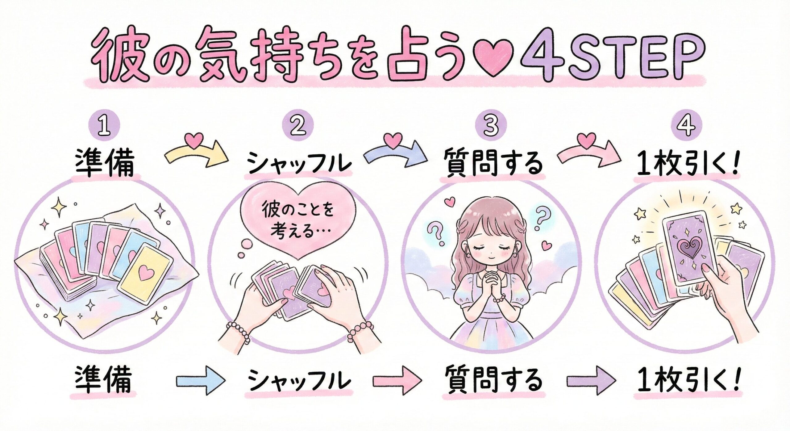 お待たせ!それじゃあ早速、彼の気持ちを知るための最もシンプルな手段である「ワンオラクル」という占い方を紹介するね。ワンオラクルは、たった1枚のカードを引くだけで占えるから、初心者さんには一番おすすめの方法なんだ。