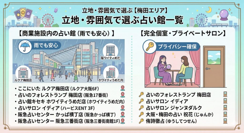 JR大阪駅、阪急梅田駅、地下鉄梅田駅が集まり、アクセス抜群です。ホワイティうめだ、阪急17番街、ルクア、HEP FIVEなど商業施設内に多数の占い館があり、雨の日でも濡れずに訪問できます。