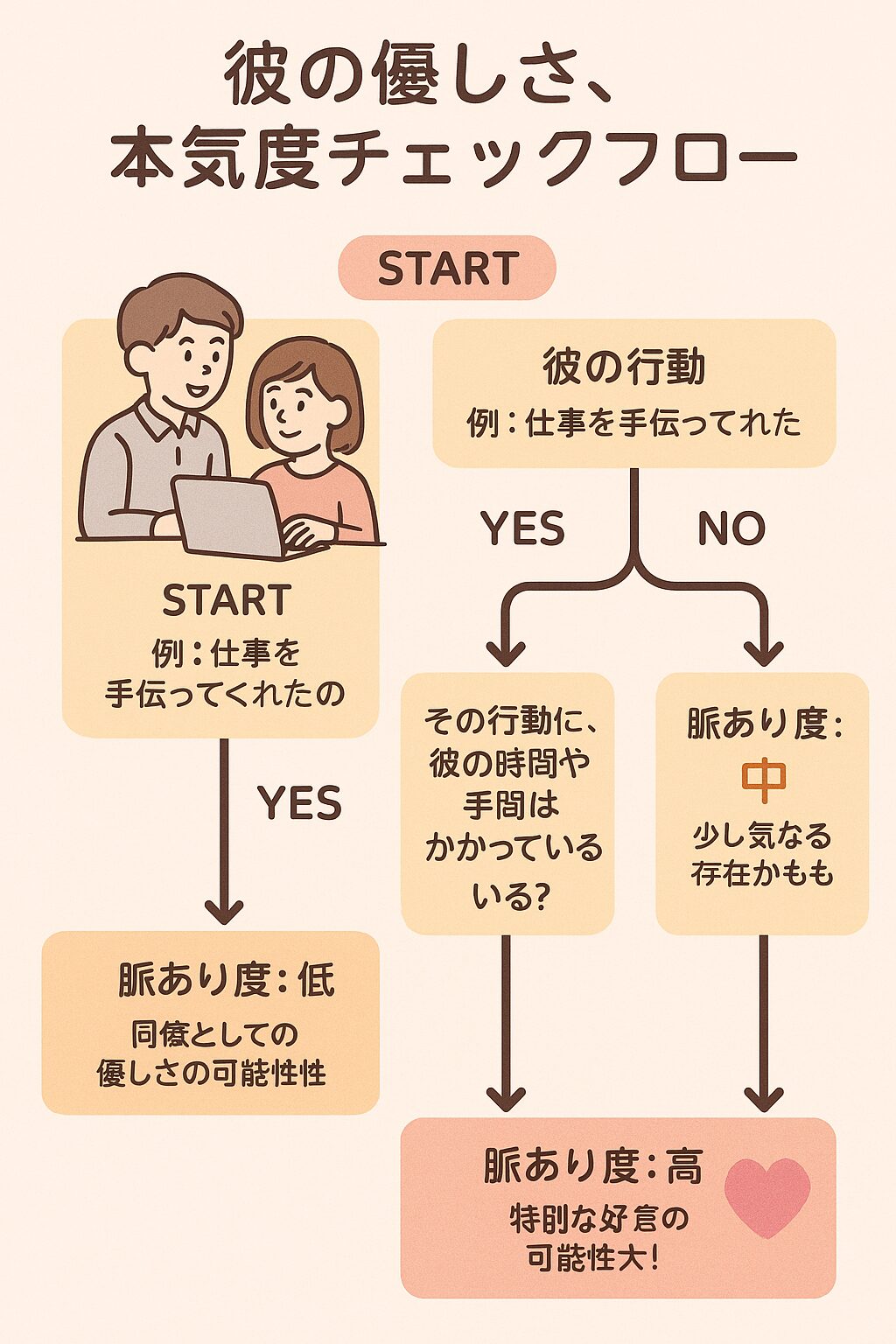 男性の好意を見極める上で最も重要なのが「特別扱い」です。誰にでも優しい男性は多いですが、その優しさが「あなた限定」のものかどうかに注目してください。例えば、他の人がいる前であなただけを褒めたり、あなたの仕事だけを率先して手伝ってくれたりする場合、それは本気度が高いサインと言えるでしょう。