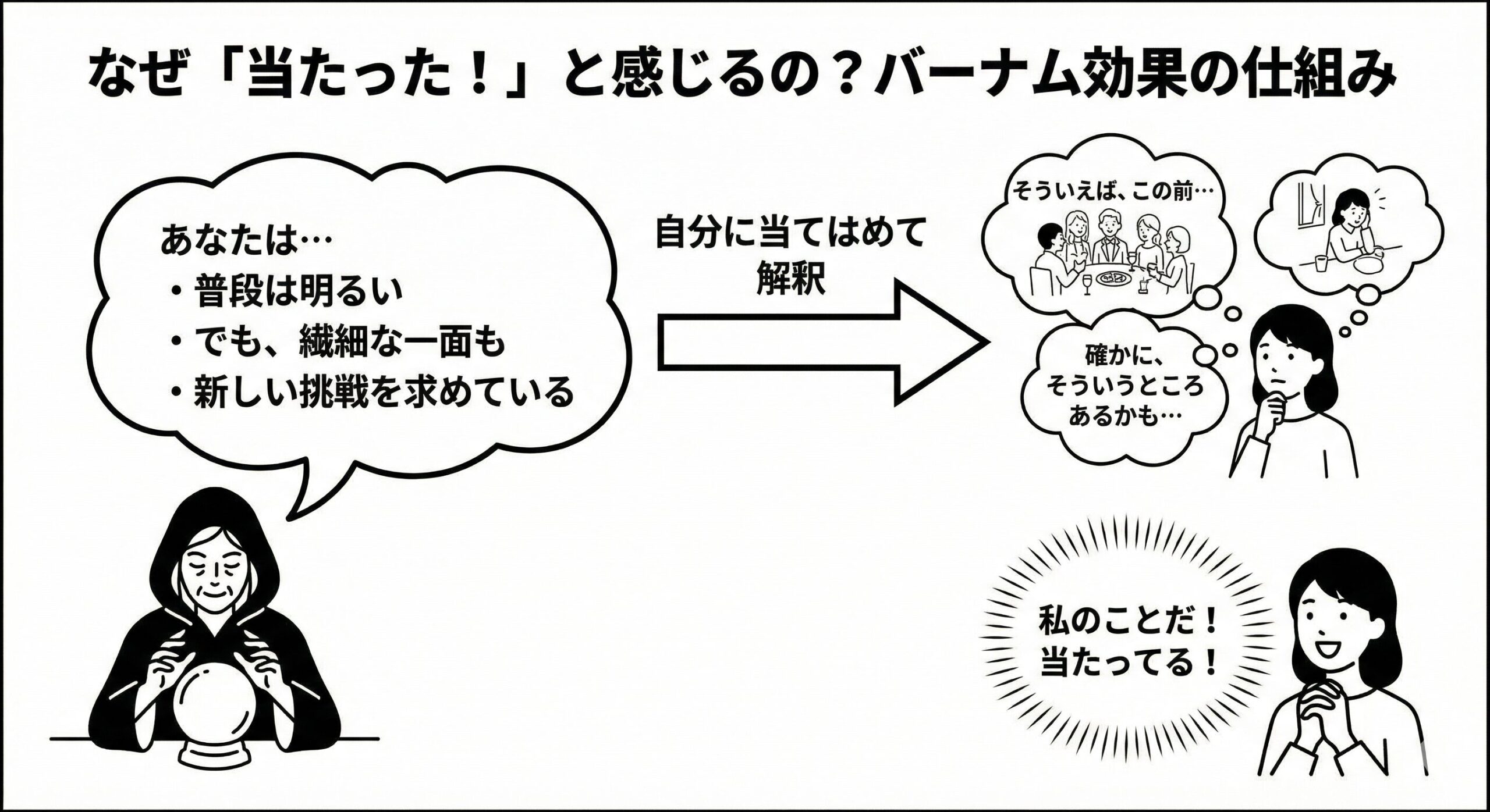 これは、「あなたは普段明るく振る舞っていますが、心の中に繊細な一面を隠していますね」といった、誰にでも当てはまるような曖昧な性格描写を、あたかも自分だけに向けられた的確な指摘であるかのように錯覚してしまう心理効果です。占いが「当たる」と感じる感覚の、まさに中核をなすのが、このバーナム効果です。多くの人が持つ共通の悩みを指摘されると、私たちは「言い当てられた」と感じてしまうのです。 - コールドリーディング:相手の反応から情報を引き出す会話術