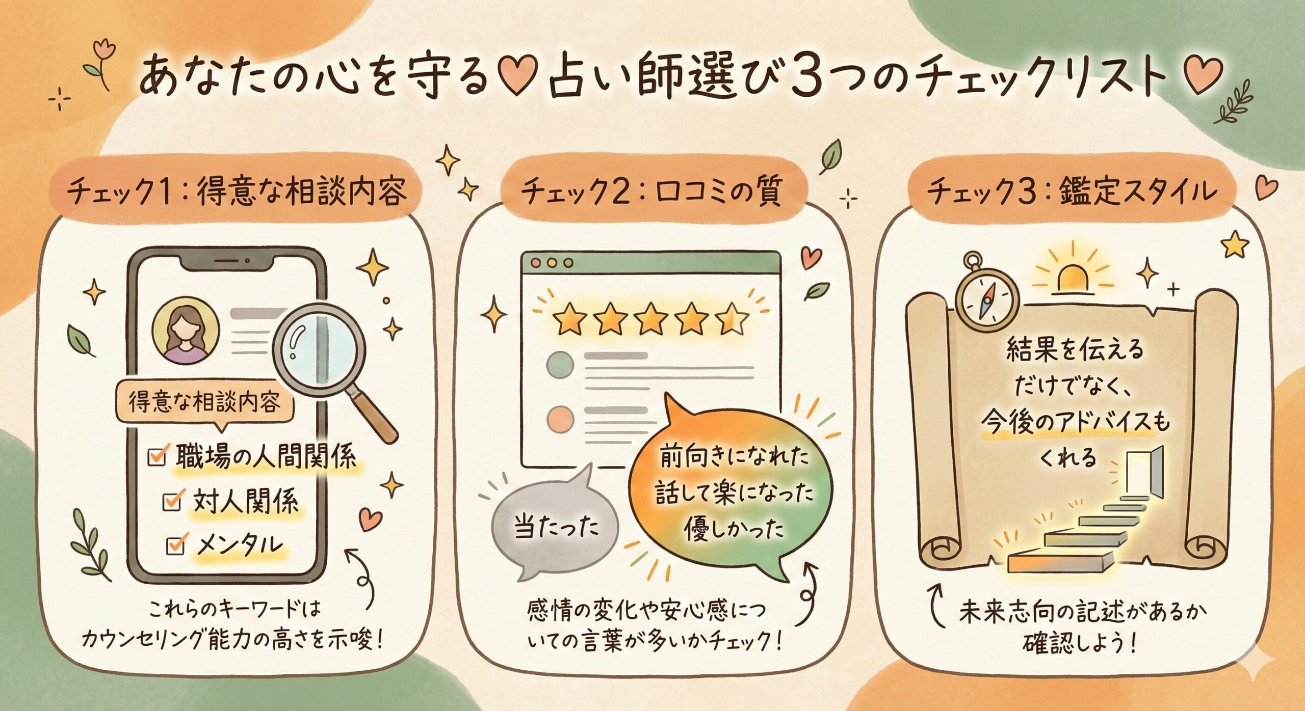 だからこそ、占い師は「当たる/当たらない」という評判だけでなく、以下の3つの「カウンセリング能力」を示すサインで選びましょう。
