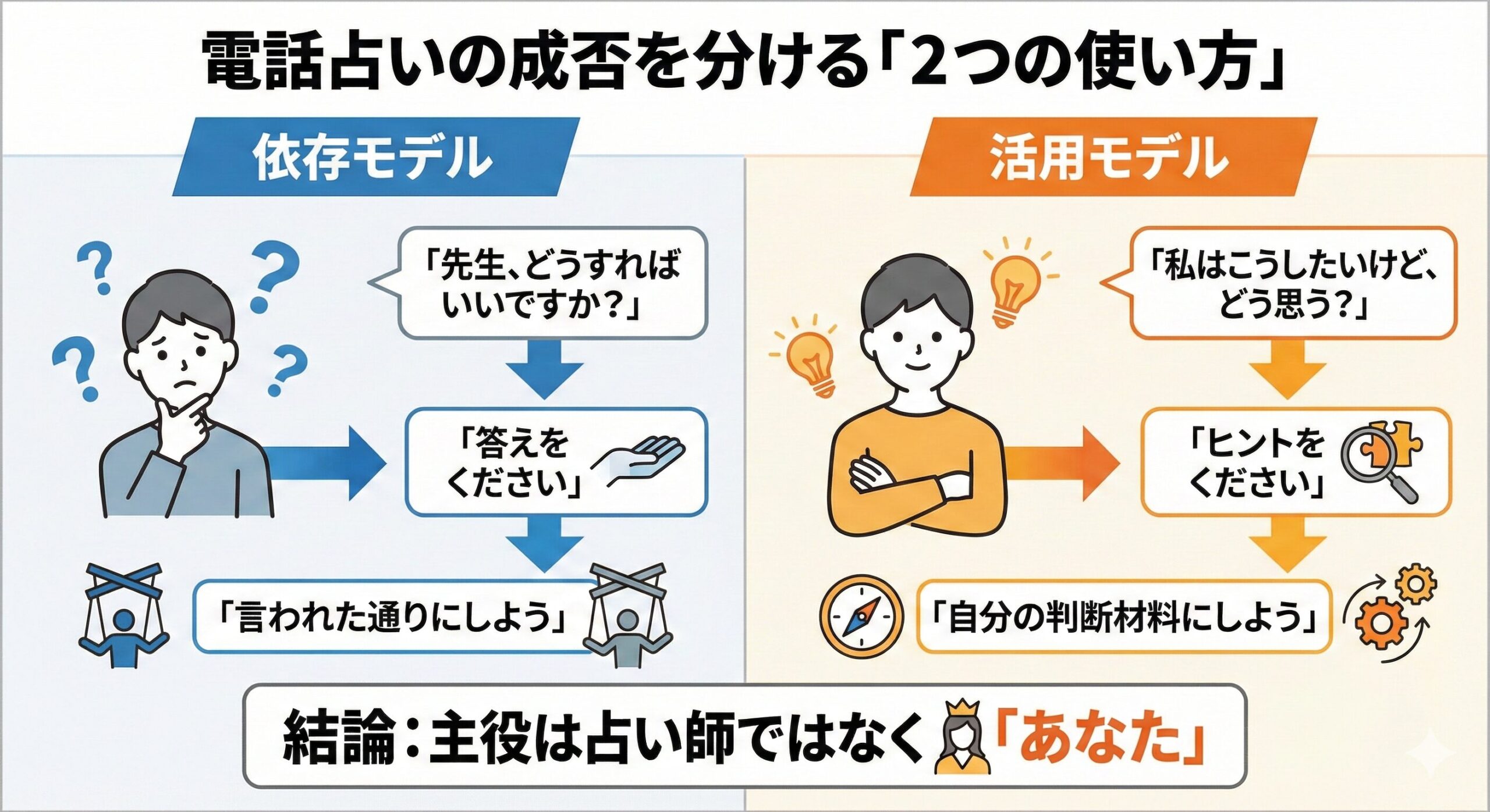 - 重要なのは「使い方」: 失敗の原因は占い師との相性だけでなく、占いに依存してしまう「使い方」にあります。